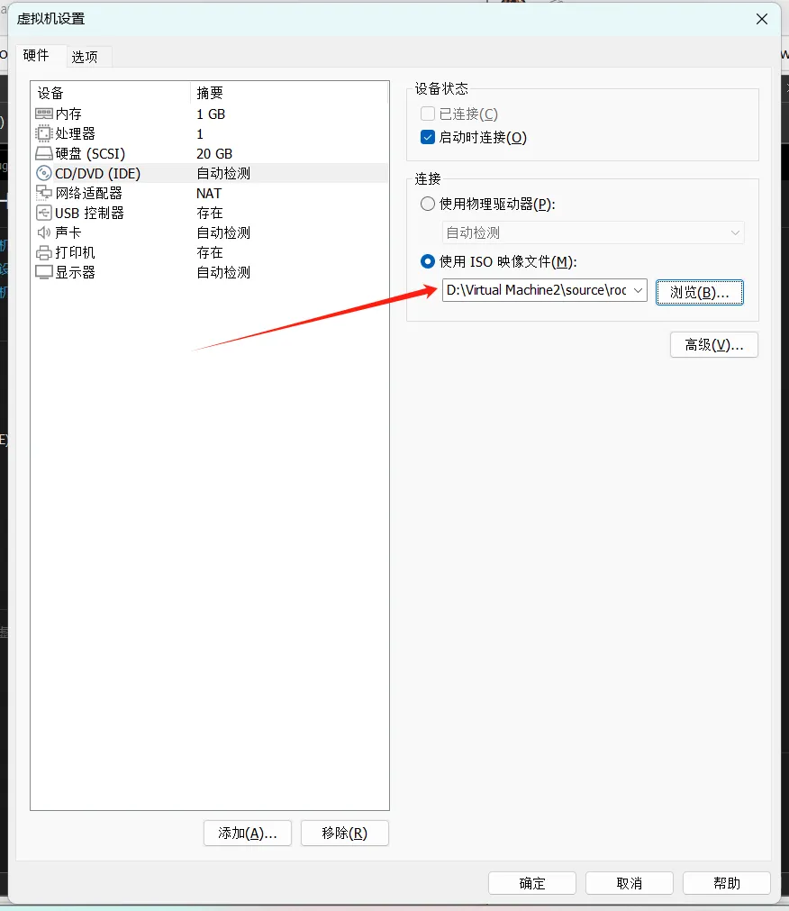 编辑虚拟机设置,CD/DVD使用ISO镜像文件,并选中准备好的Roo镜像