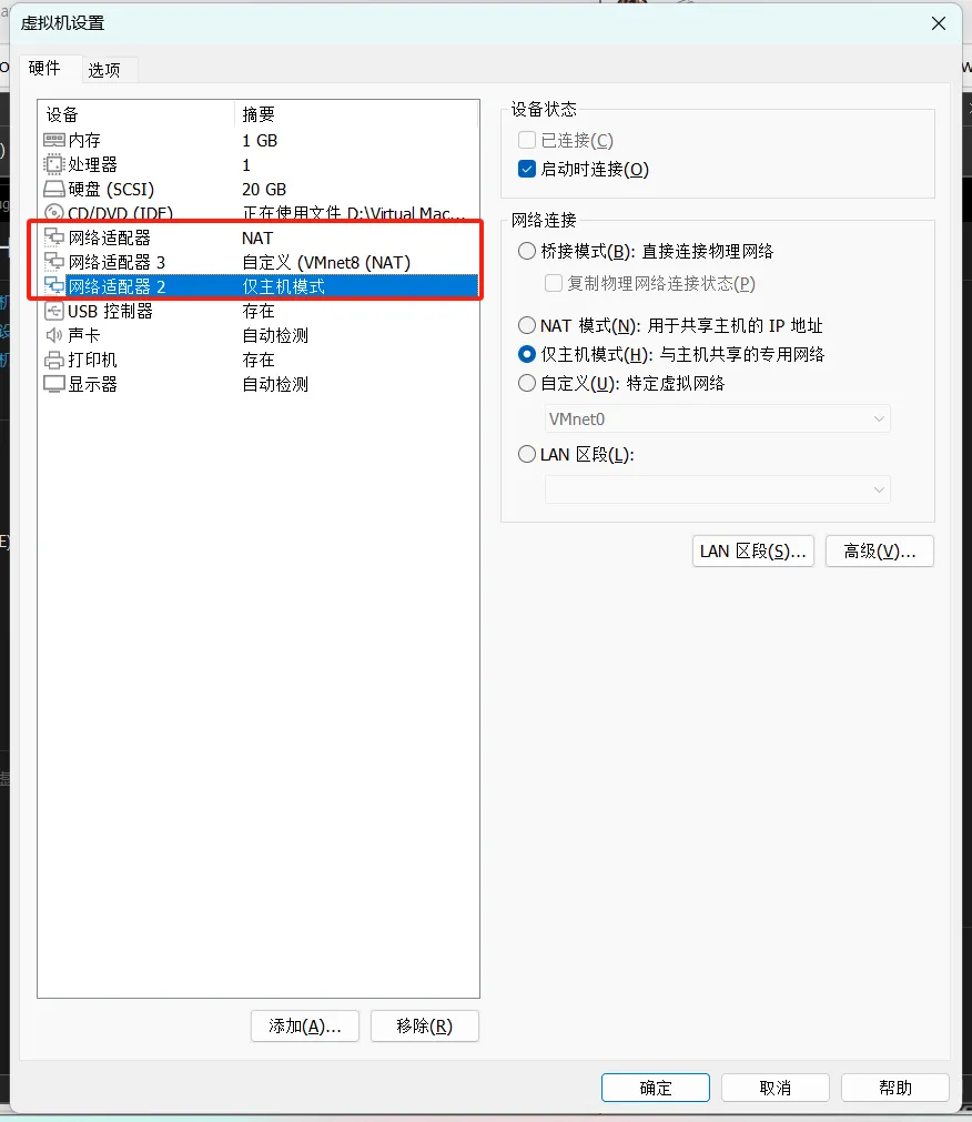 为其增加两个网络适配器,网络适配器2设置为主机模式,网络适配器3连接至VMnet8(外网)