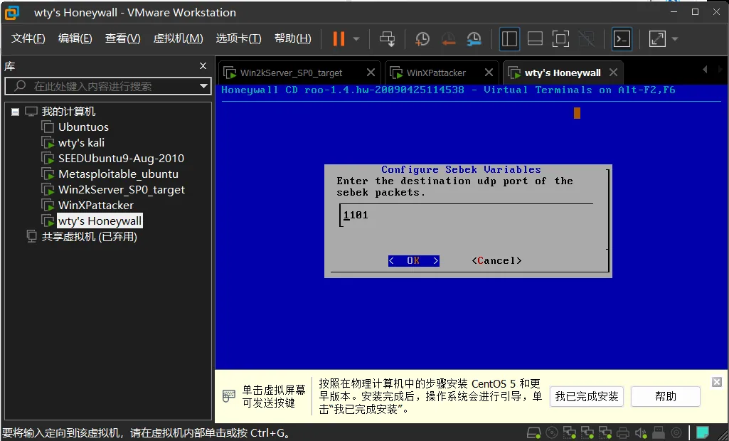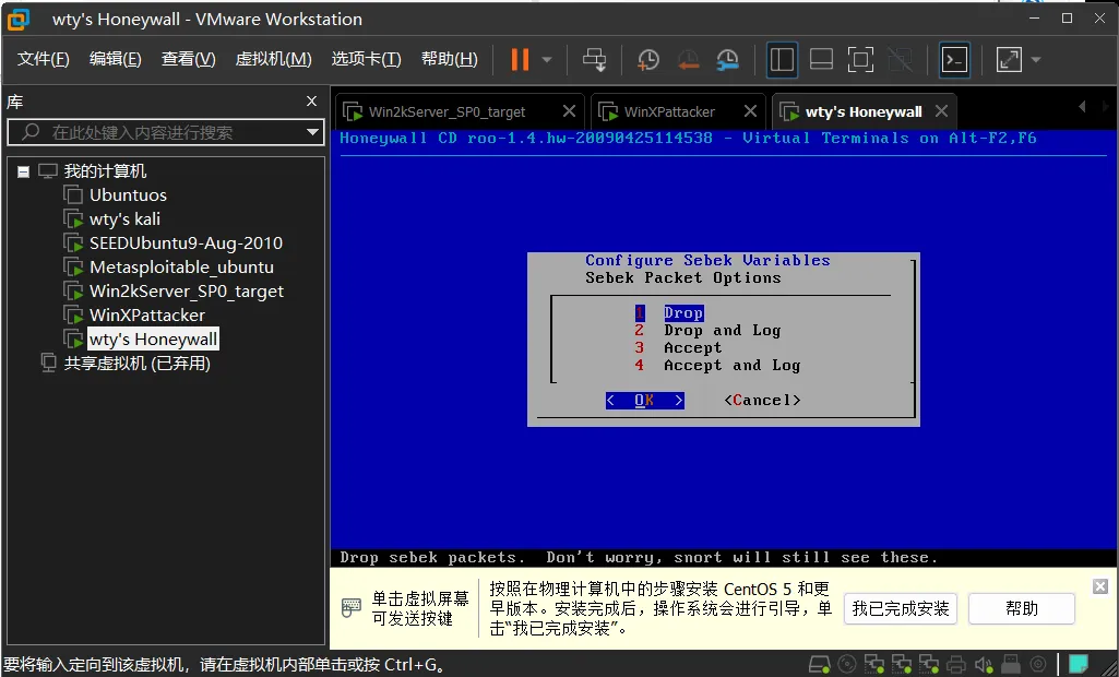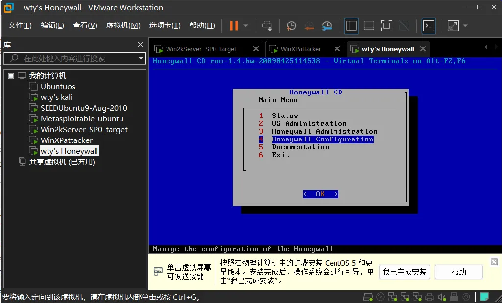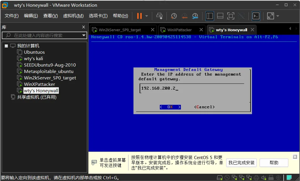 使用用VMware Workstation软件及虚拟机镜像,搭建一个初步的网络攻防环境,包括3台攻击机,2台靶机,并安装配置蜜网,并保证每个设备的连通性,进行连通性测试。