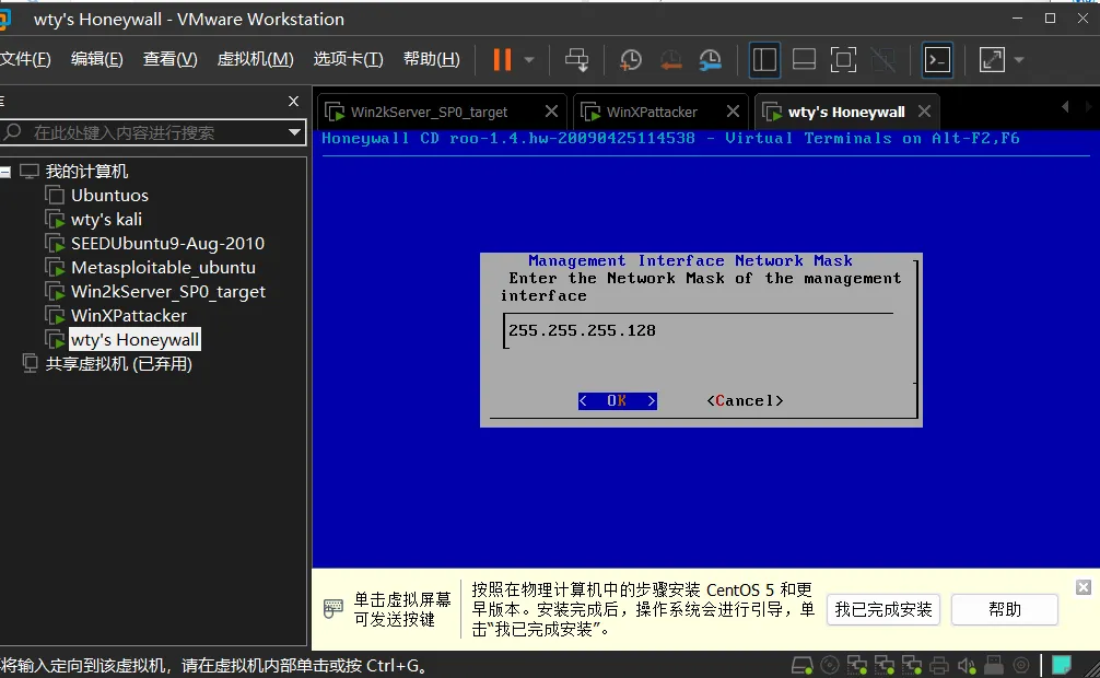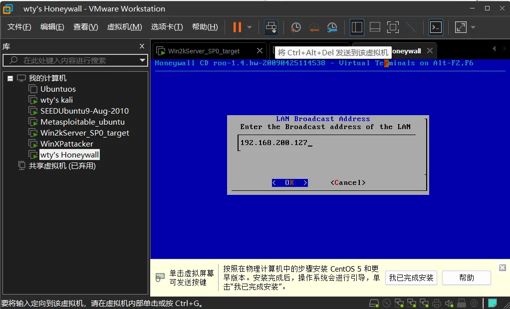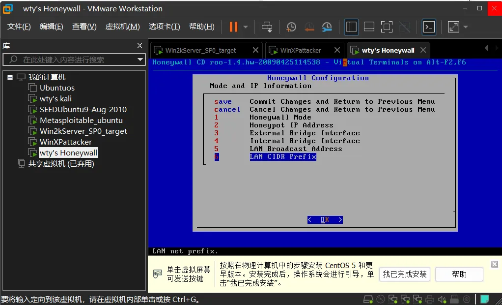 选择第六项设置蜜网网段,按照示例输入设置的蜜网网段192.168.200.0/25
