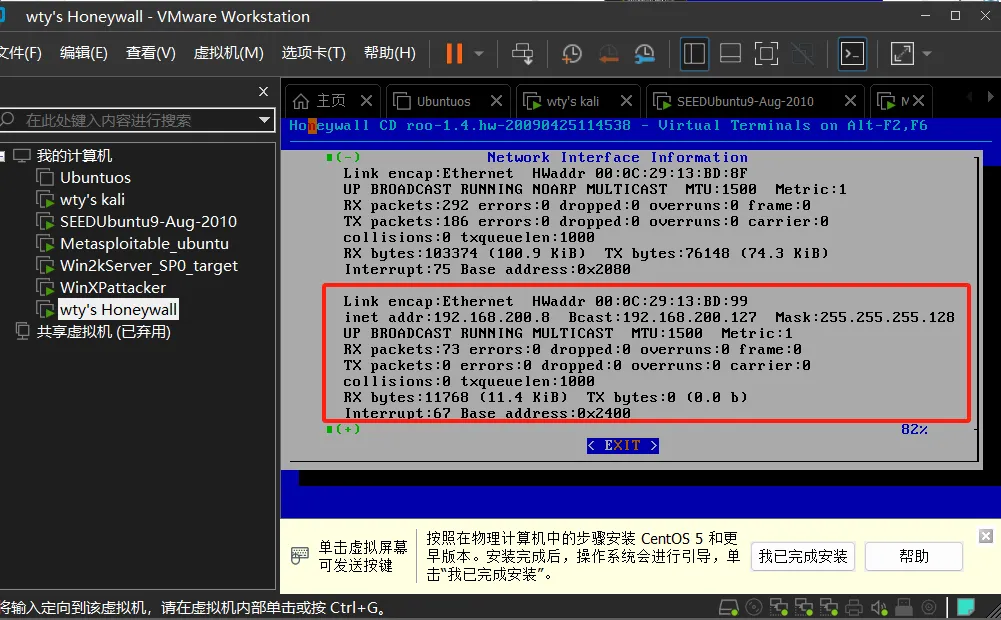 - 问题1解决方案:检查整个配置过程发现,在配置蜜网网关时完全按照了视频中的教程将默认网关设置为了192.168.200.1,后来查看VMwareWorkstation中的虚拟网络编辑器发现,NAT模式的VMnet8中的NAT设置中的网关是192.168.200.2,将蜜网网关中的配置相应的修改后问题解决