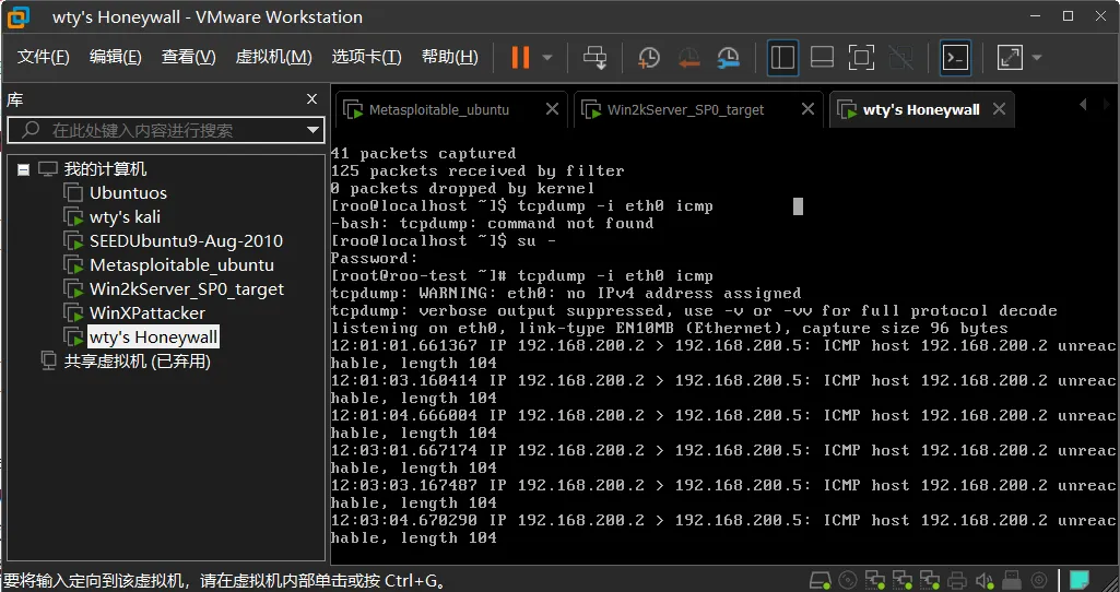 在蜜网网关输入命令tcpdump -i eth0 icmp进行监听测试