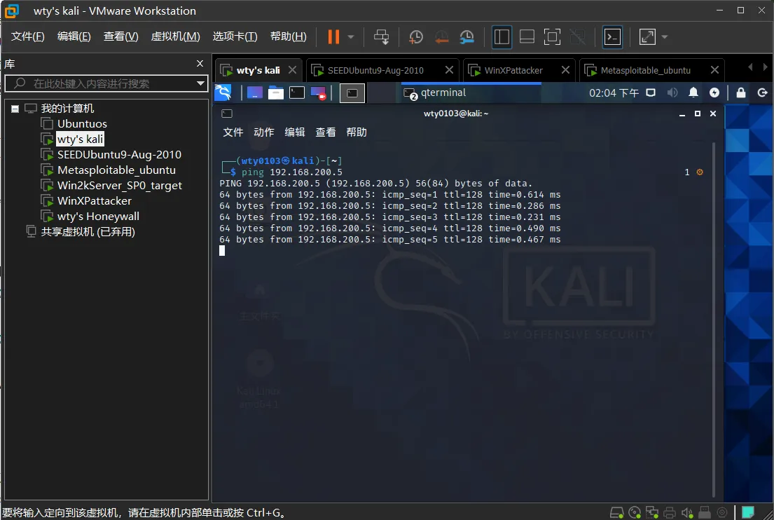 使用Kali攻击机(192.168.200.3)Ping命令pingWinXP(192.168.200.5)虚拟机