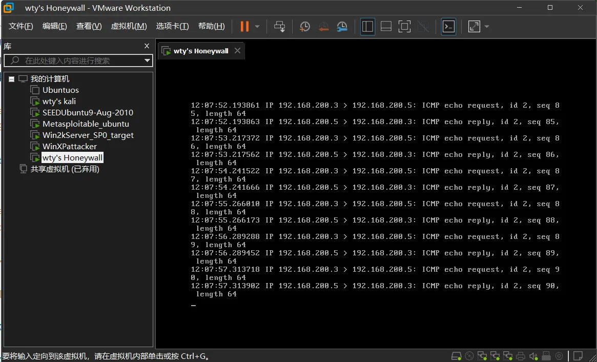 在蜜网网关虚拟机中能够看到监听Kali与WinXP间的往来通讯信息,测试成功