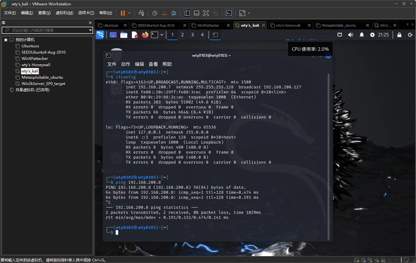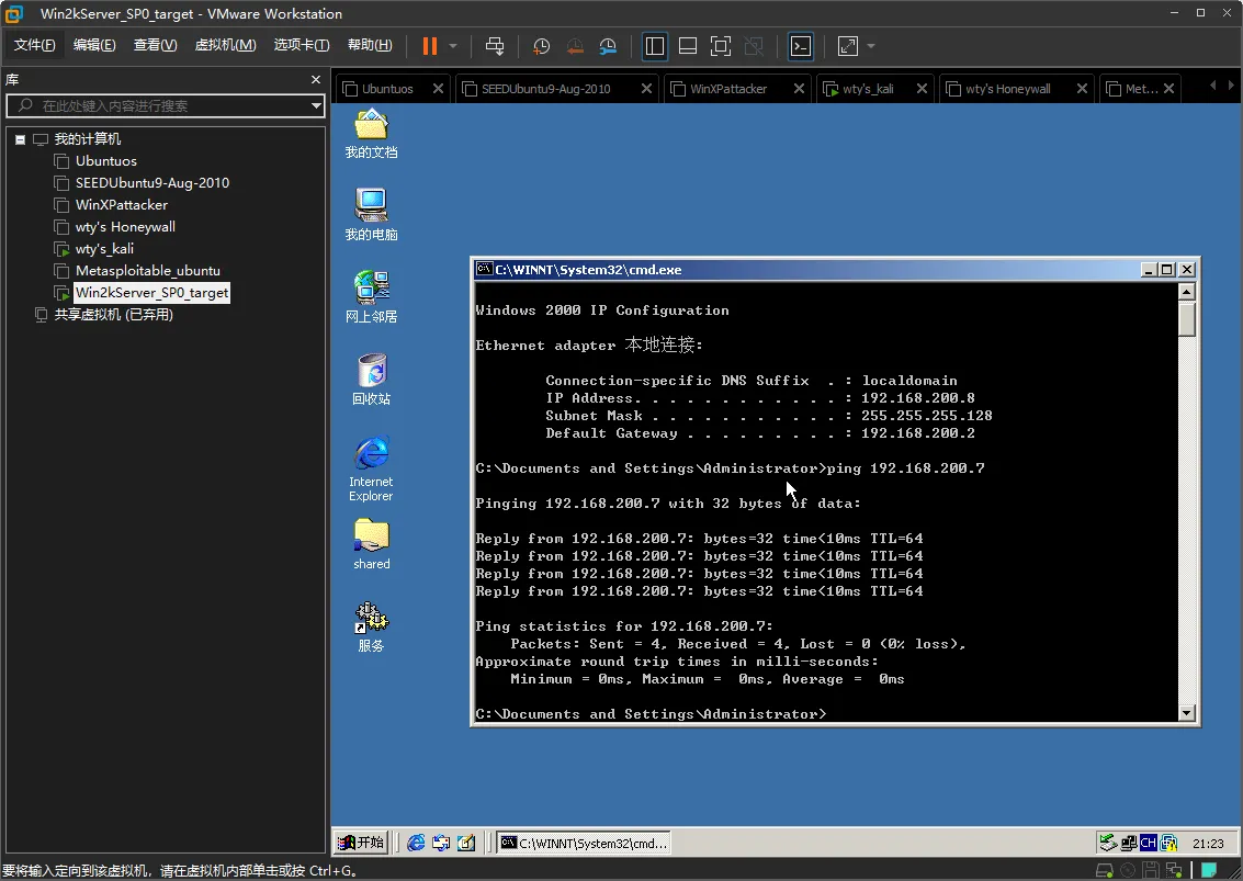 启动靶机win2k和攻击机kali,查看到靶机ip地址为192.168.200.8,攻击机ip地址为192.168.200.7,测试二者之间的连通性正常