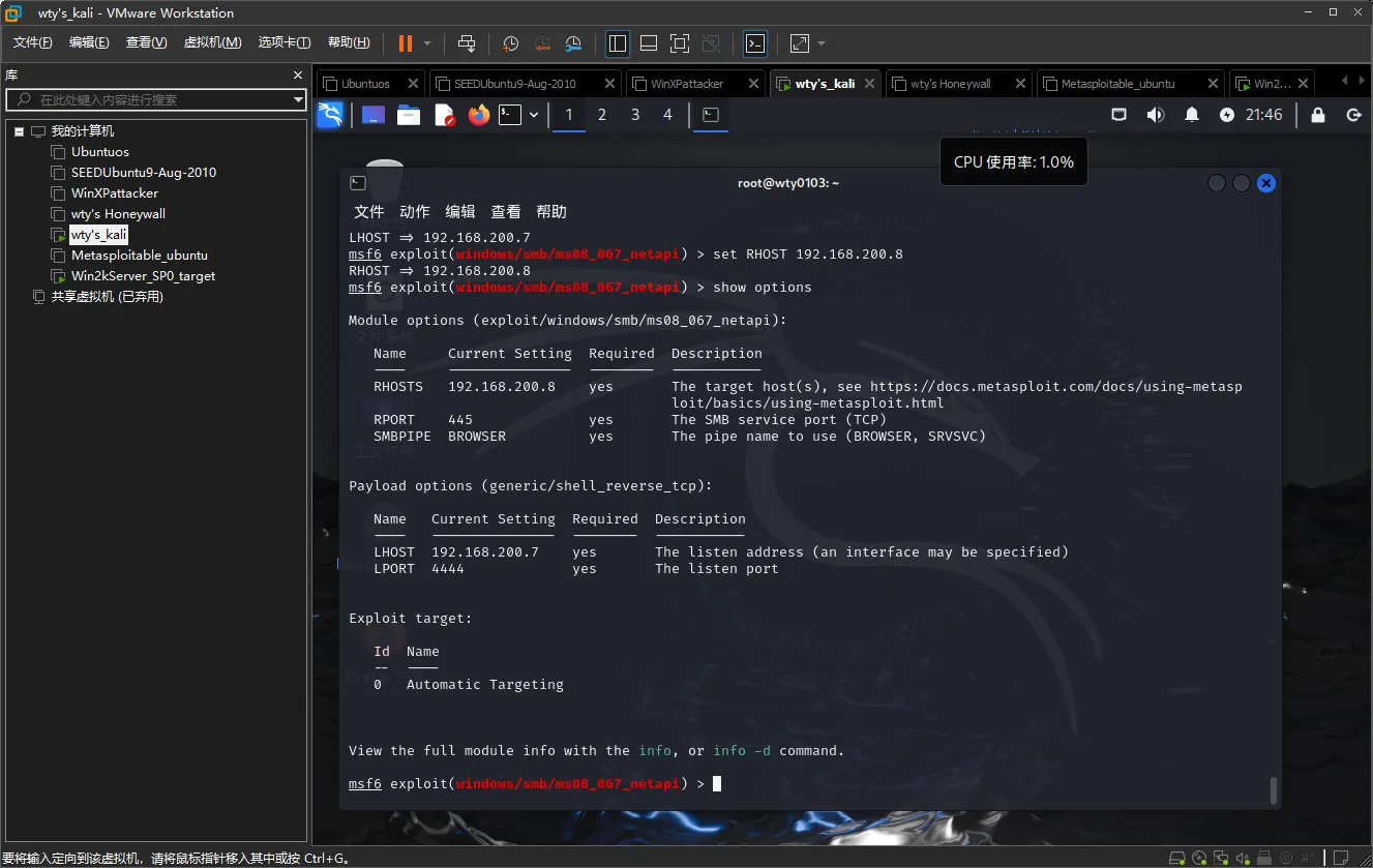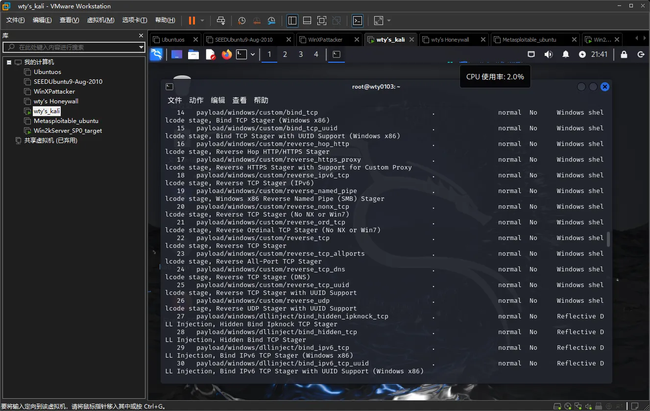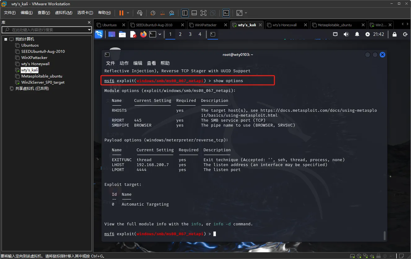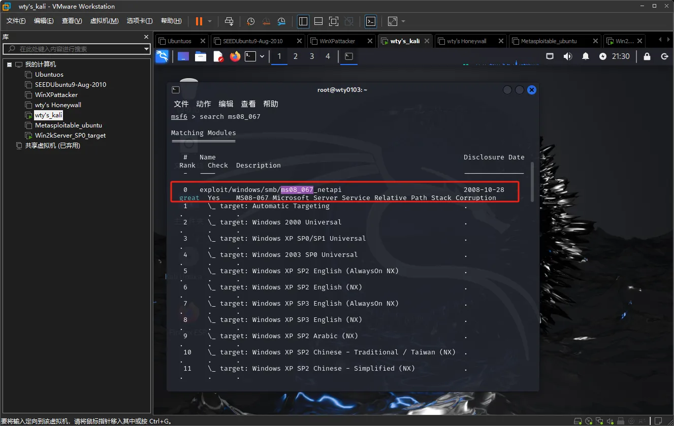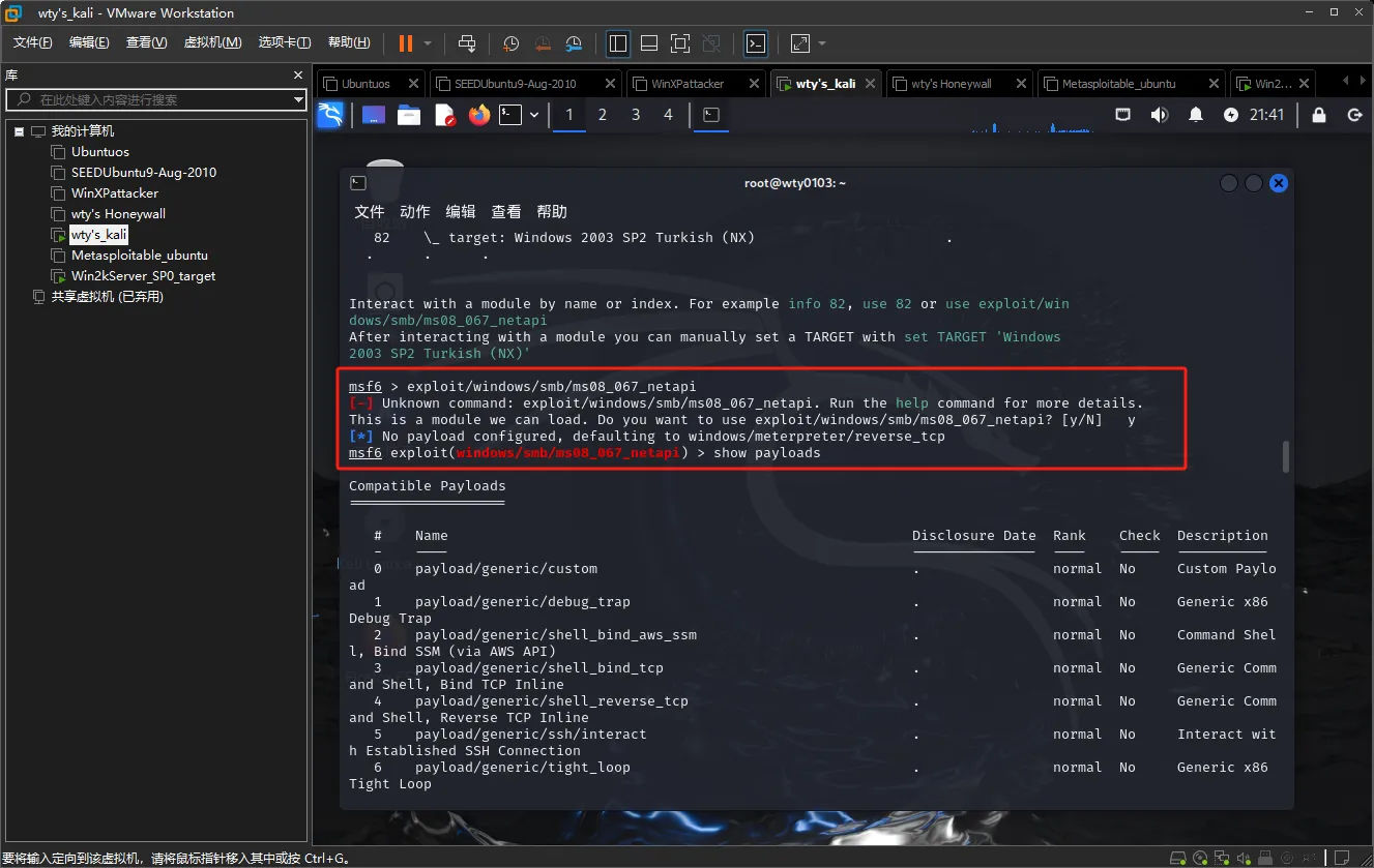 输入命令exploit/windows/smb/ms08_067_netapi,然后输入命令show payloads显示可攻击载荷