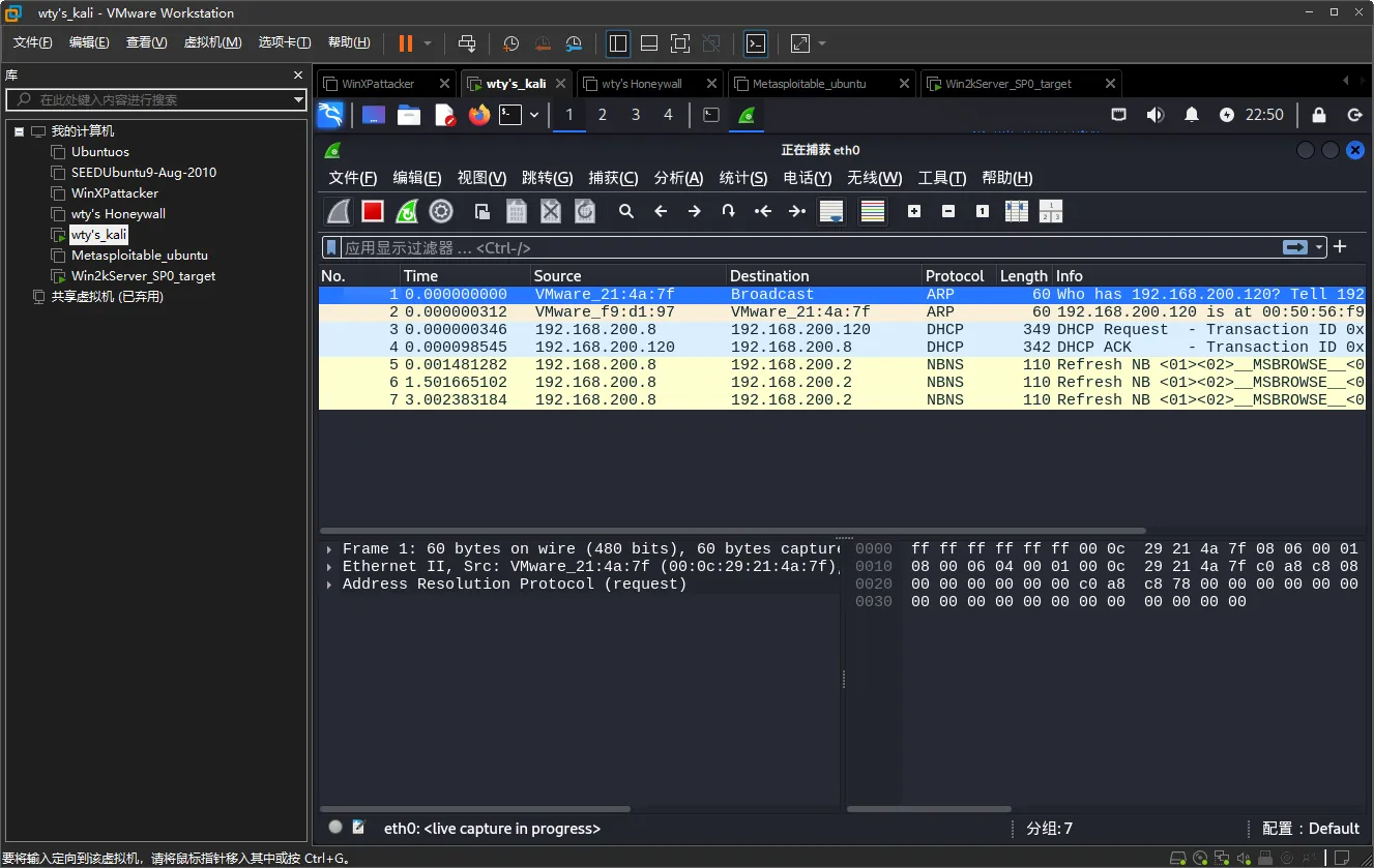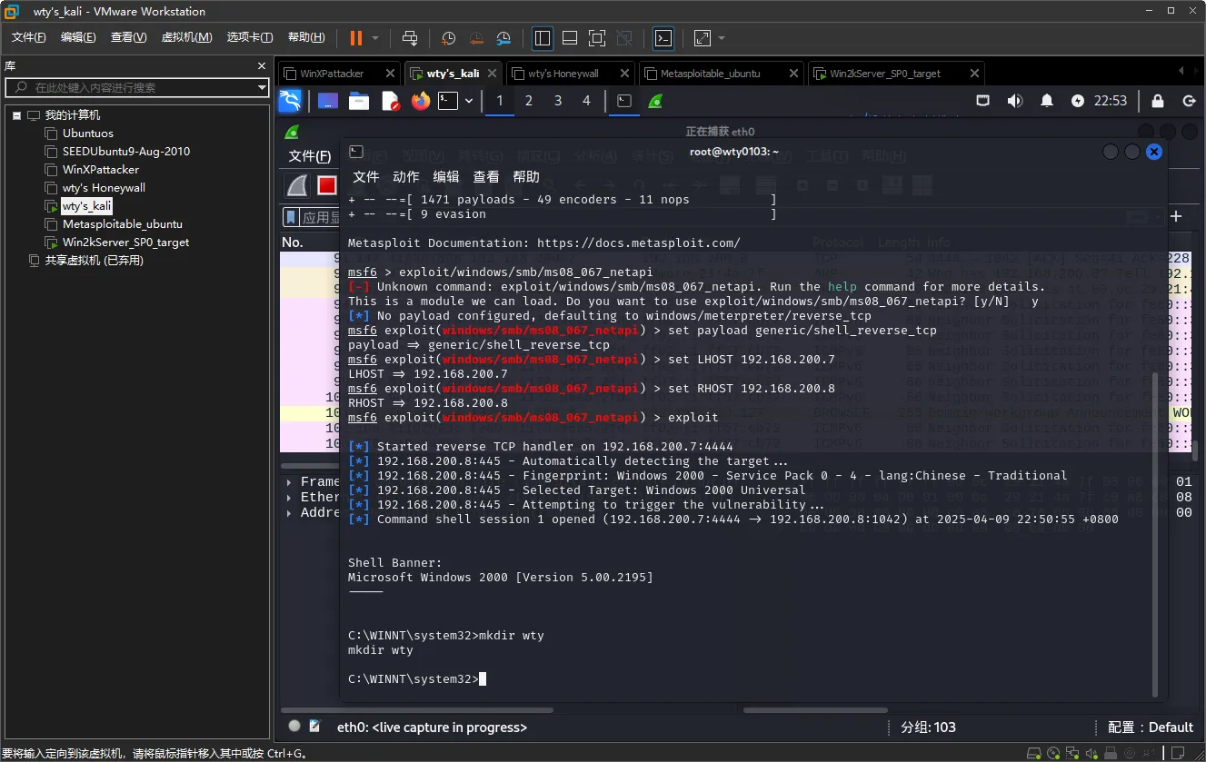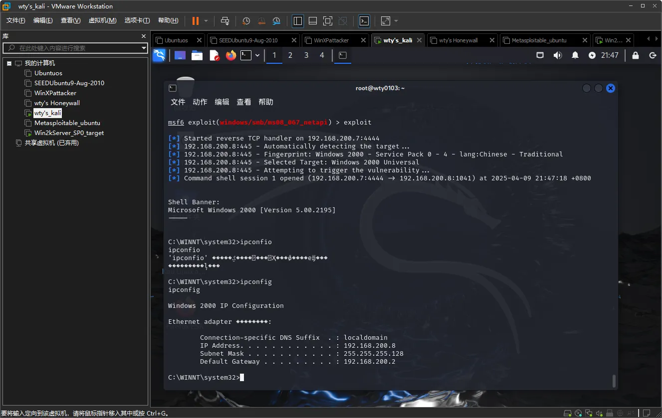 攻击方wty's_kali(ip:192.168.200.7),防守方Win2kserver_SP0_target(ip:192.168.200.8)