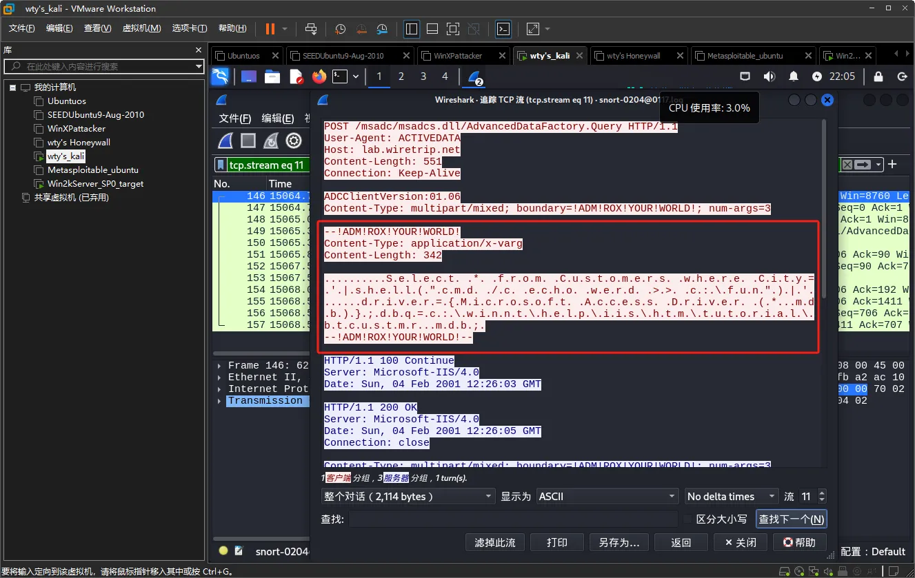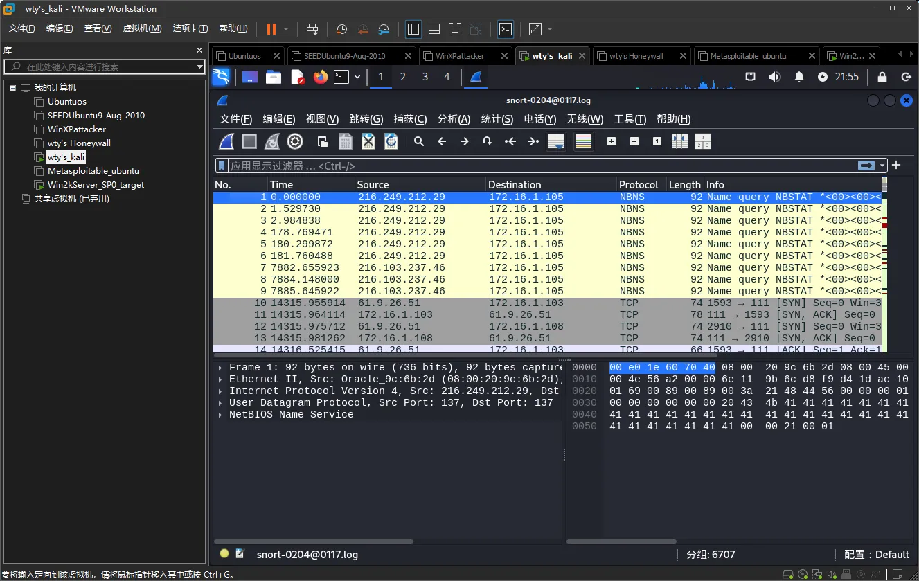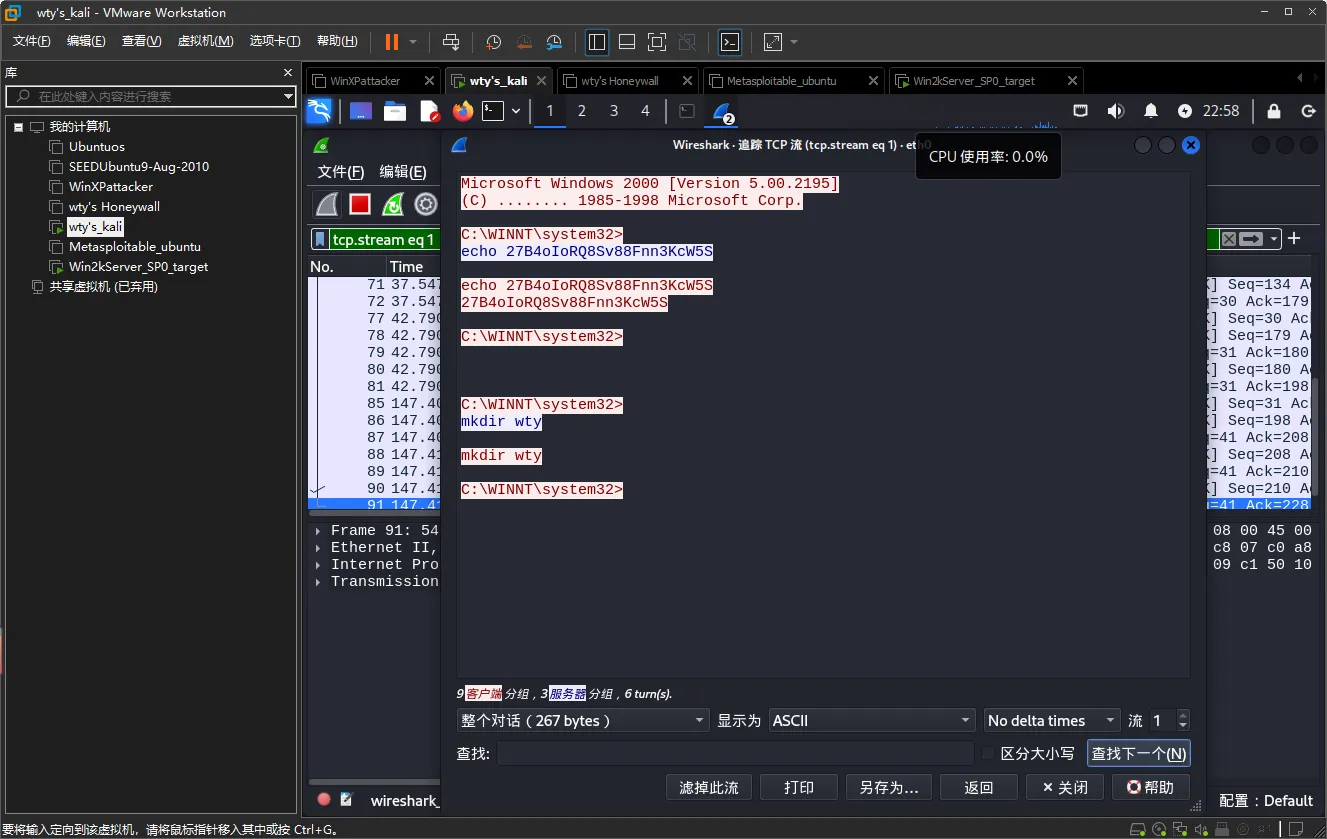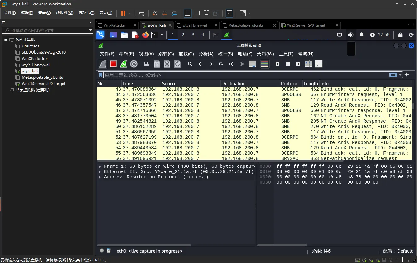 同2.1中的步骤,配置好攻击方和防守方,启动wireshark抓包
