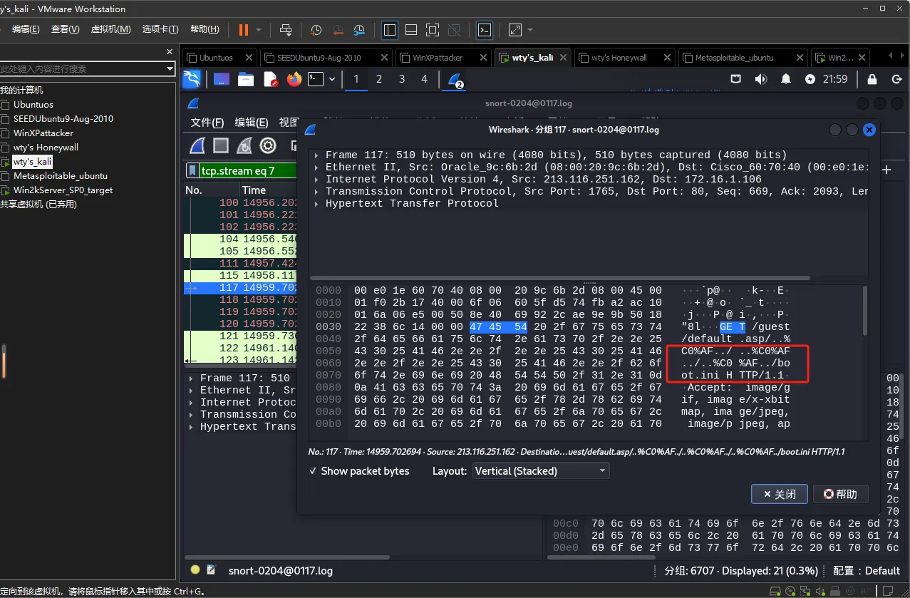 找到117行的http数据包,根据数据包中的内容,特殊字符串%C0%AF是/的unicode编码,由此判断攻击者进行了unicode攻击并打开了boot.in文件