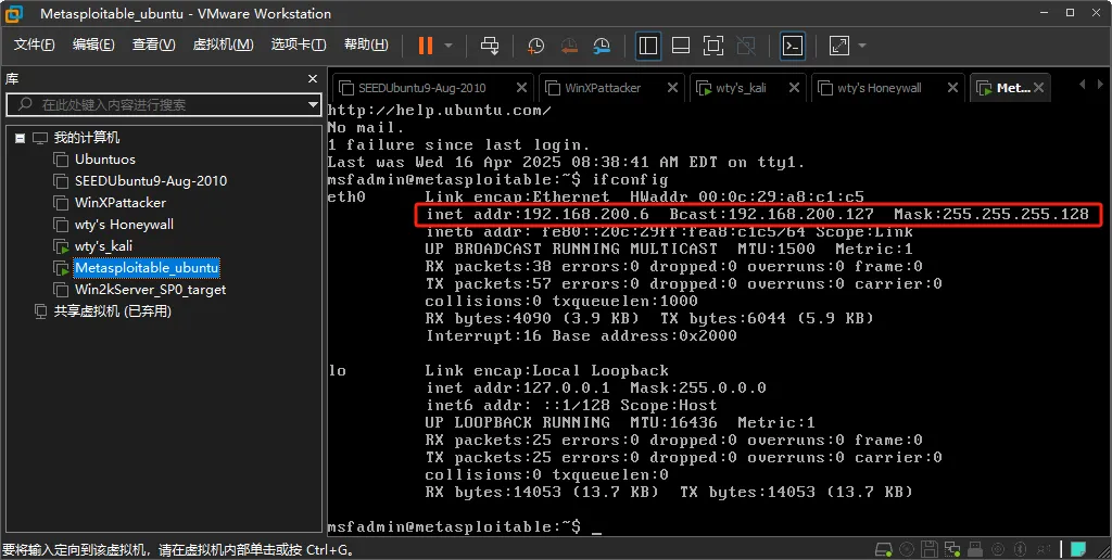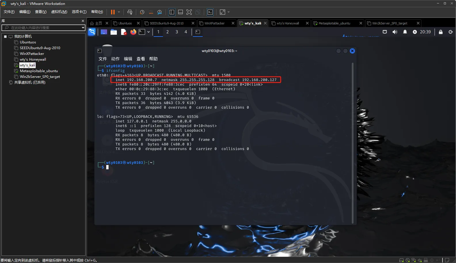 启动kali虚拟机和Metasploitable虚拟机,使用命令查看二者的网络信息,kali虚拟机IP地址位192.168.200.7,Metasploitable虚拟机的IP地址位192.168.200.6
