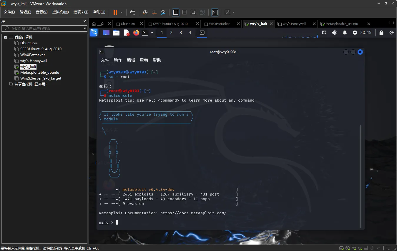 在kali虚拟机中切换root权限后输入命令msfconsole启动Metasploit渗透软件