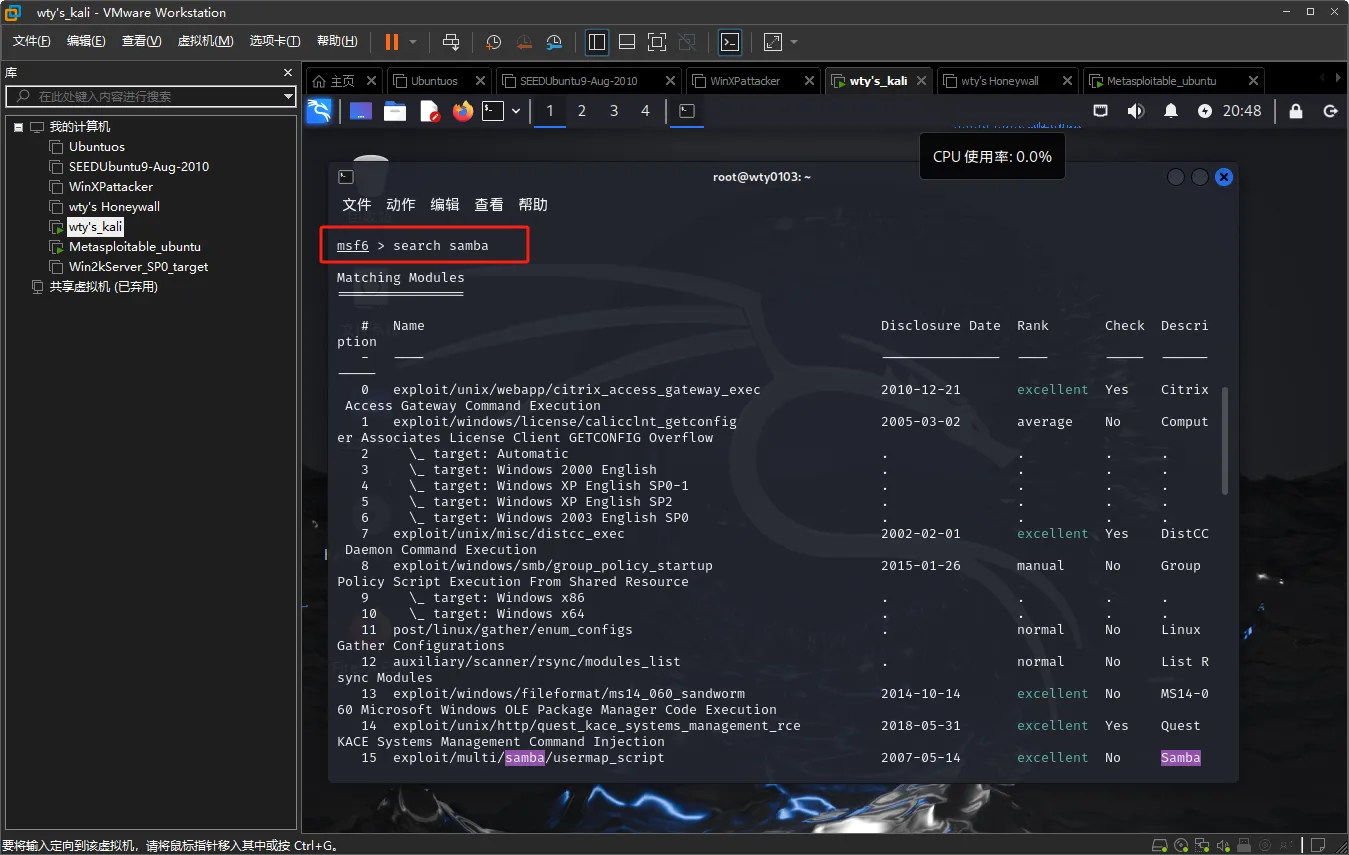 输入命令search samba查找要使用的漏洞模块