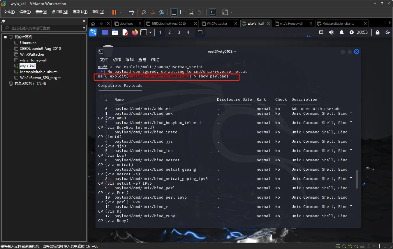 输入命令show payloads查看与该渗透攻击模块相兼容的攻击载荷