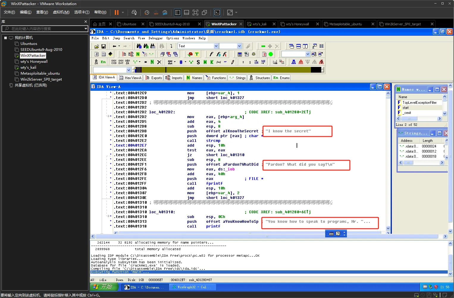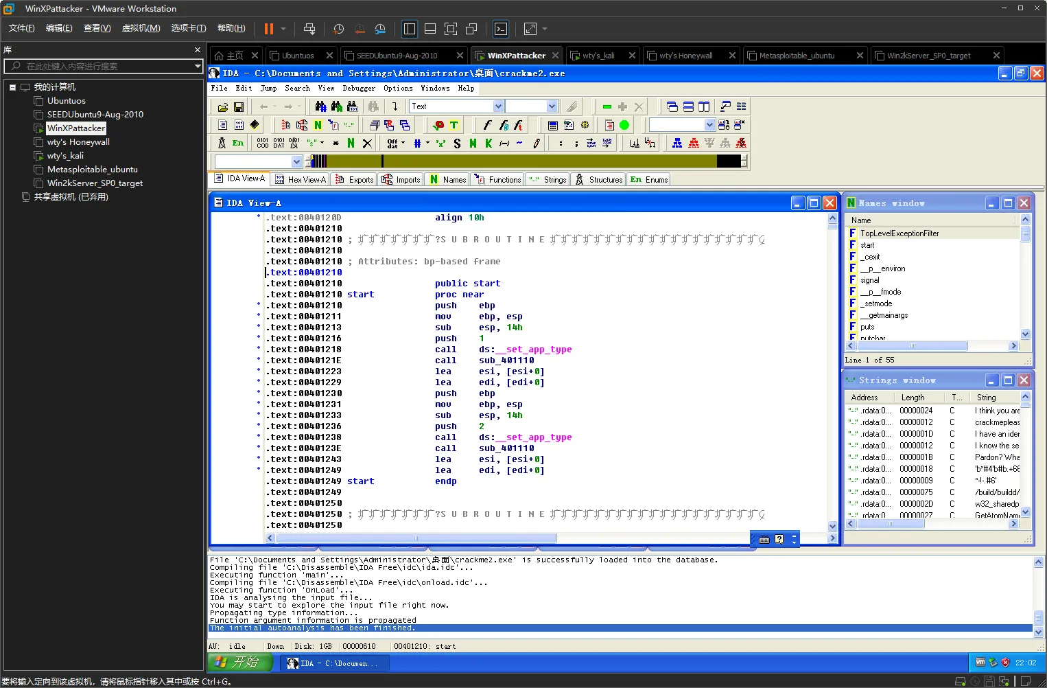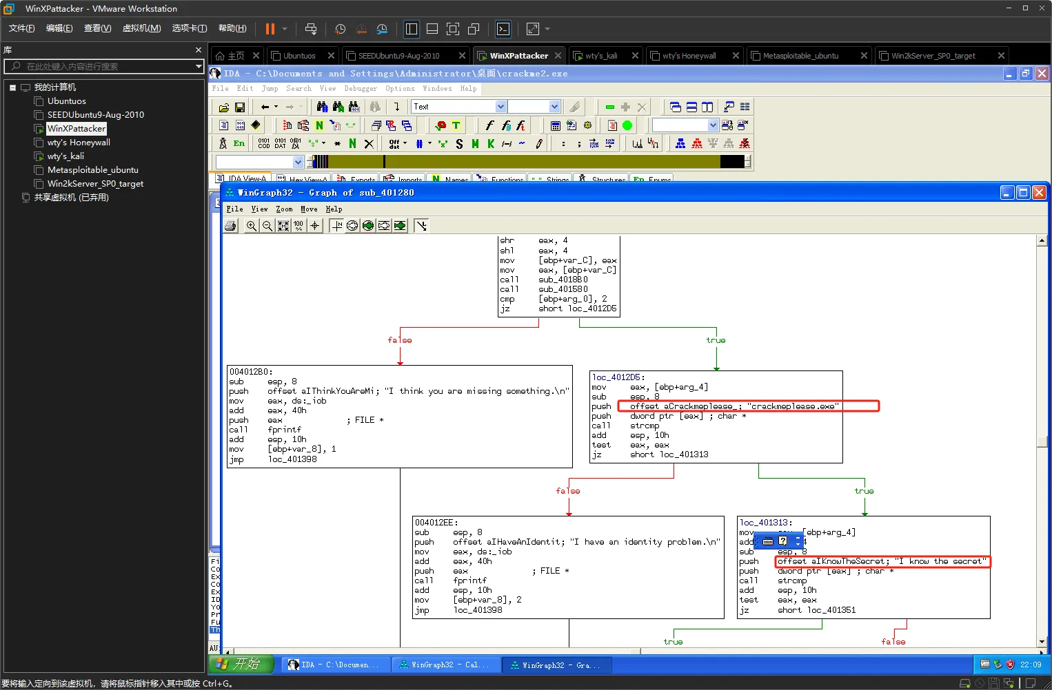 任务:在WinXP Attacker虚拟机中使用IDA Pro静态或动态分析crackme1.exe和crackme2.exe,寻找特定的输入,使其能够输出成功信息。