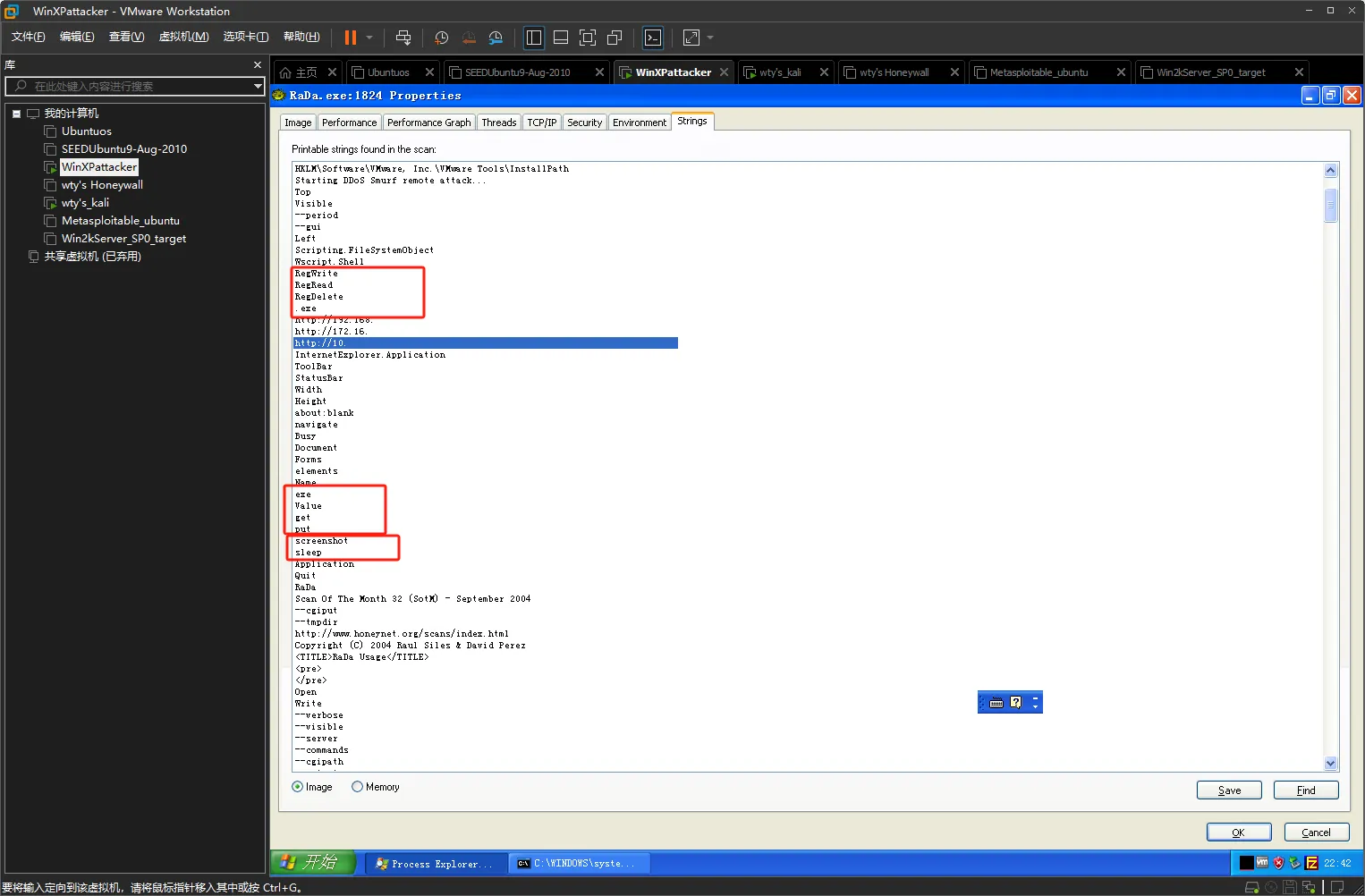 打开process explorer,运行RaDa.exe并查看string,结合显示的信息进行分析可以得出以下结论。RaDa.exe被执行时,它会将自身安装到系统C盘中,程序运行后,在实验主机的C盘下创建了一个RaDa目录,里面一个bin文件夹,一个tmp文件夹,RaDa.exe通过修改注册表的方式使得系统启动,启动后每隔一段时间会尝试与10.10.10.10建立tcp连接,将下载的信息保存到tmp文件夹中,然后将RaDa.exe复制到bin文件夹中,准备DDos攻击