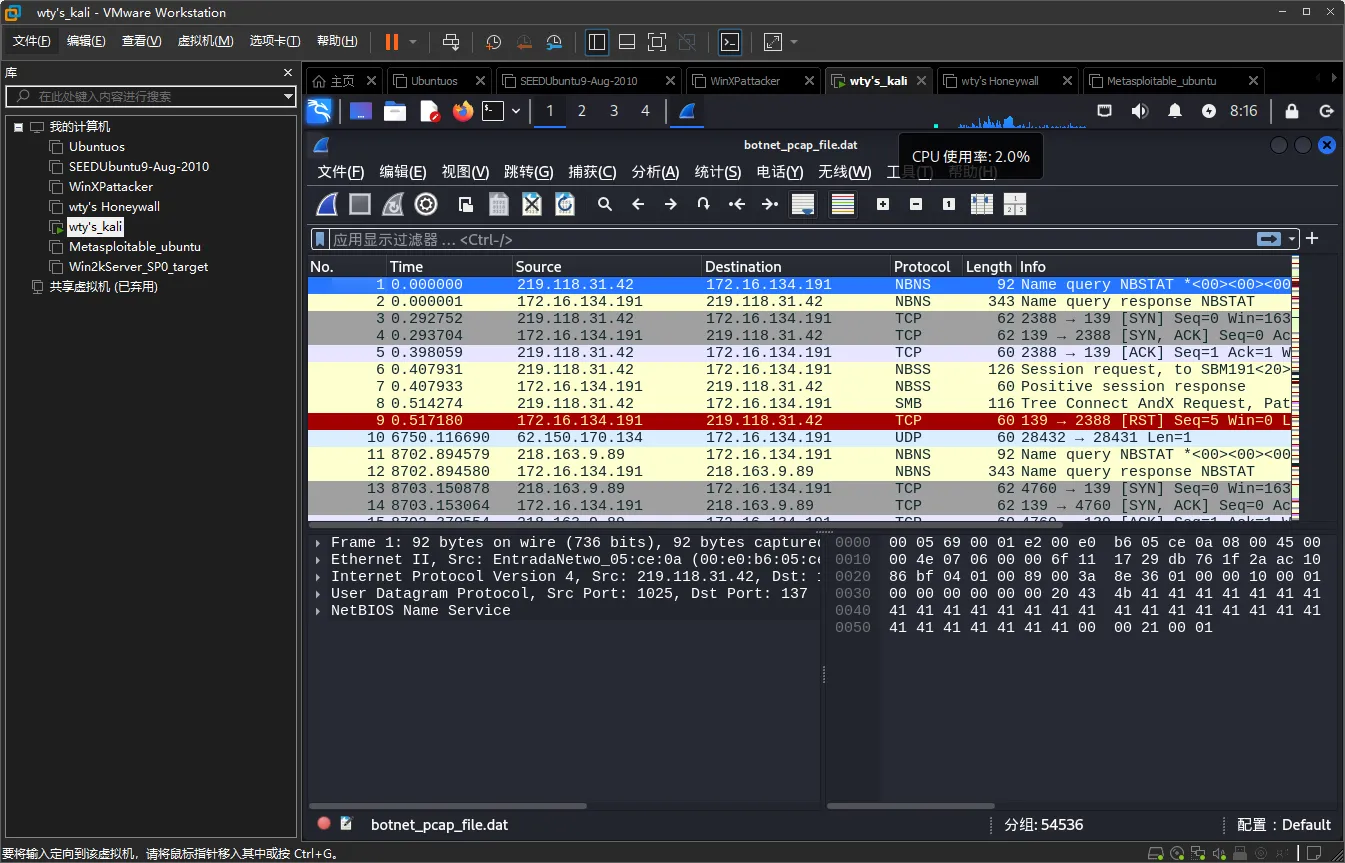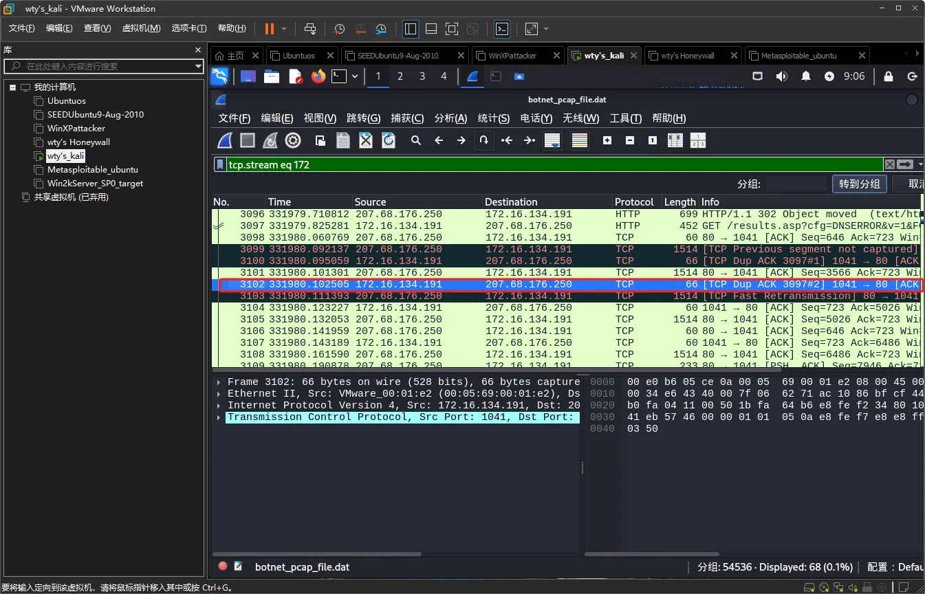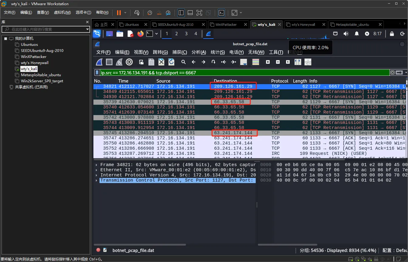 将botnet_pcap_file.dat拷贝到kali虚拟机后使用wireshark将其打开