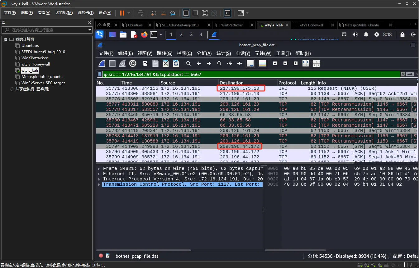 3、蜜罐主机(IP地址:172.16.134.191)与那些IRC服务器进行了通信?