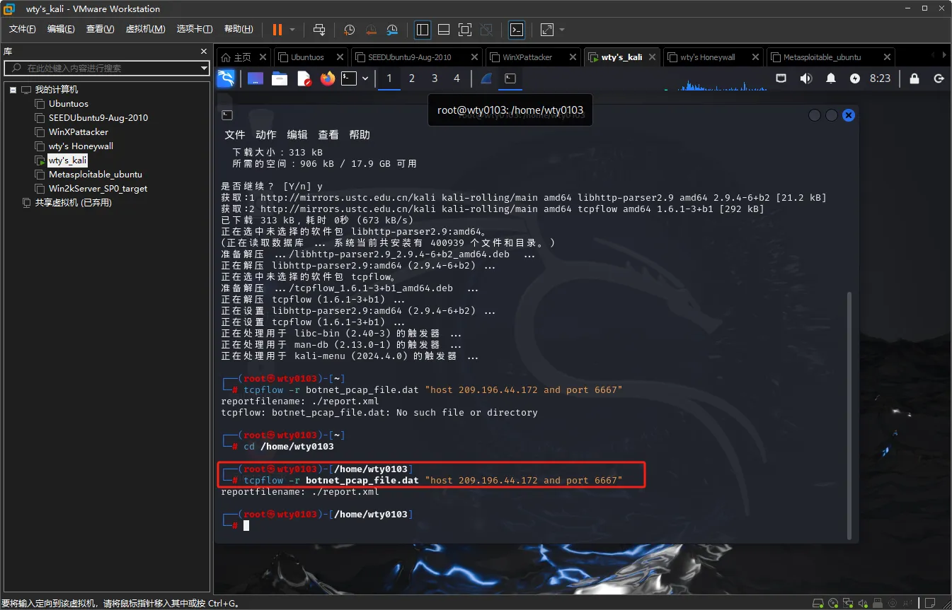 在kali虚拟机中安装tcpflow包后,切换到botnet_pcap_file.dat所在的文件夹后,使用命令tcpflow -r botnet_pcap_file.dat "host 209.196.44.172 and port 6667"来获取IRC数据包
