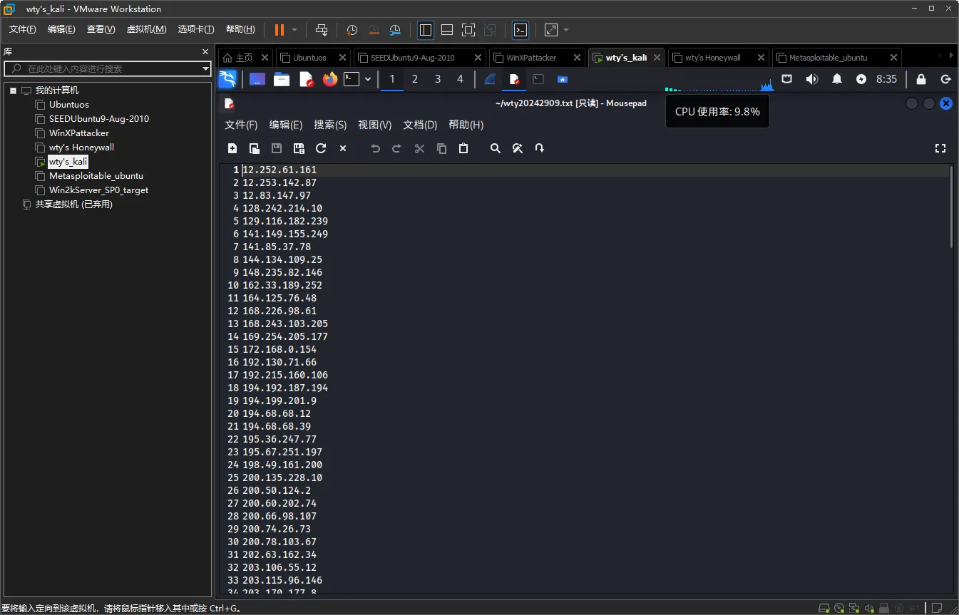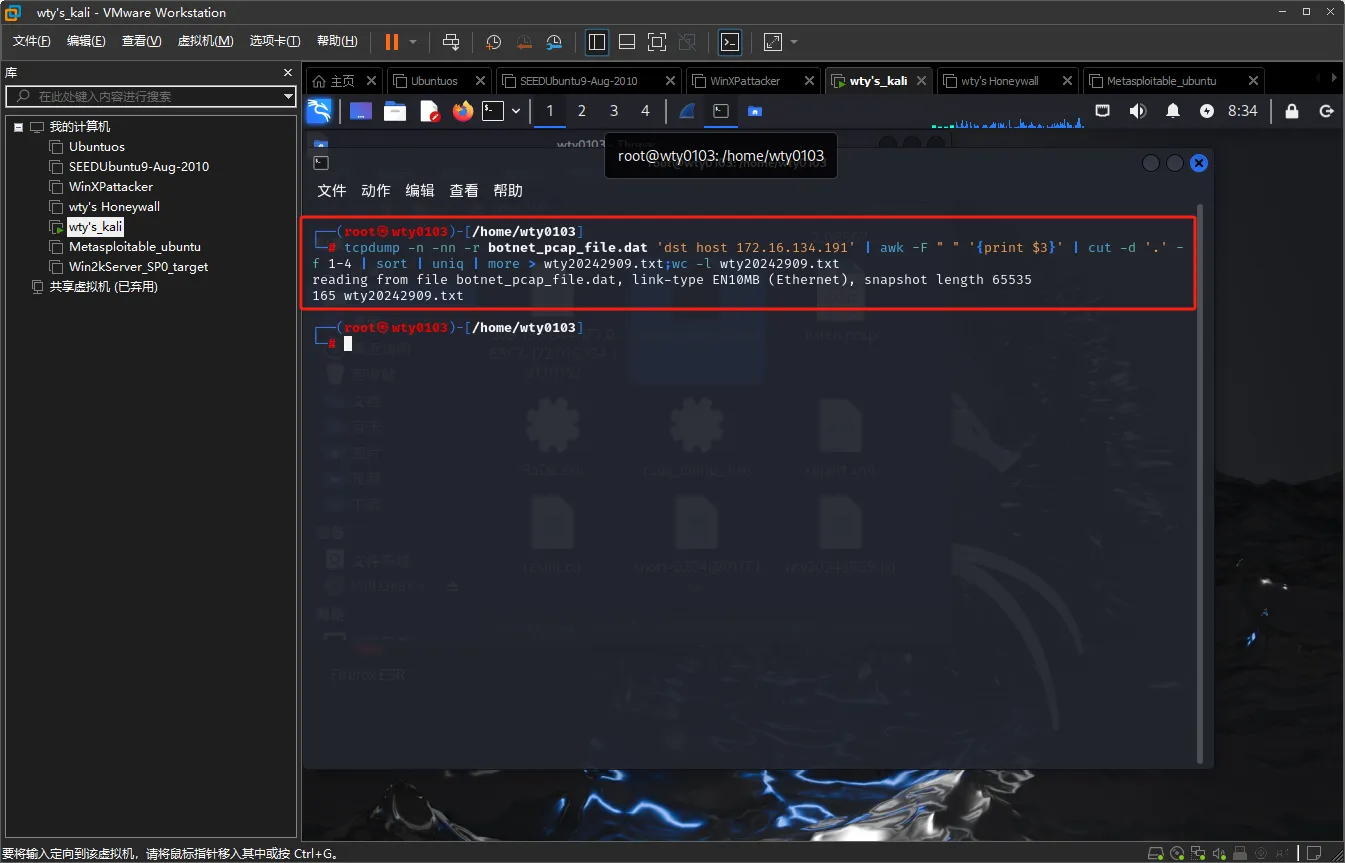 使用命令找出所有连接主机的IP地址,将IP地址存入wty20242909.txt文档中,显示有165个IP地址