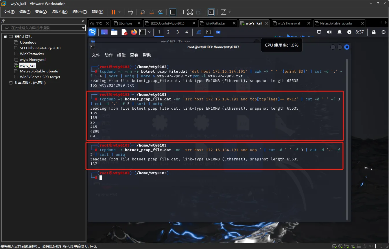 任务:分析的数据源是用Snort工具收集的蜜罐主机5天的网络数据源,并通过编辑去除了一些不相关的流量并将其组合到了单独的一个二进制网络日志文件中,同时IP地址和其他特定敏感信息都已经被混淆以隐藏蜜罐主机的实际身份和位置。回答下列问题: