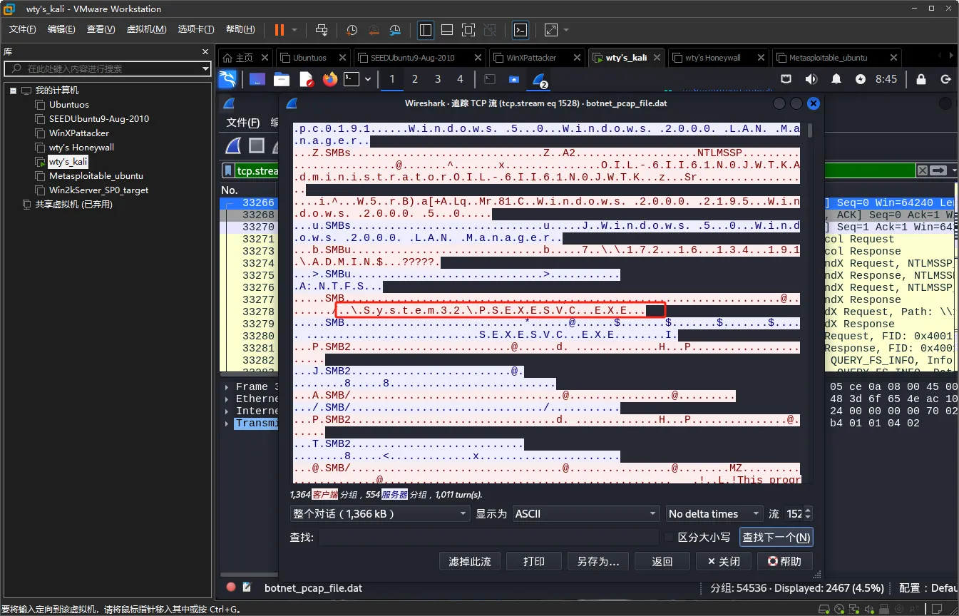 分析445号tcp端口,追踪tcp流,看到有psexesvc.exe的字符,说明445号tcp端口遭到了Dv1dr32蠕虫的入侵