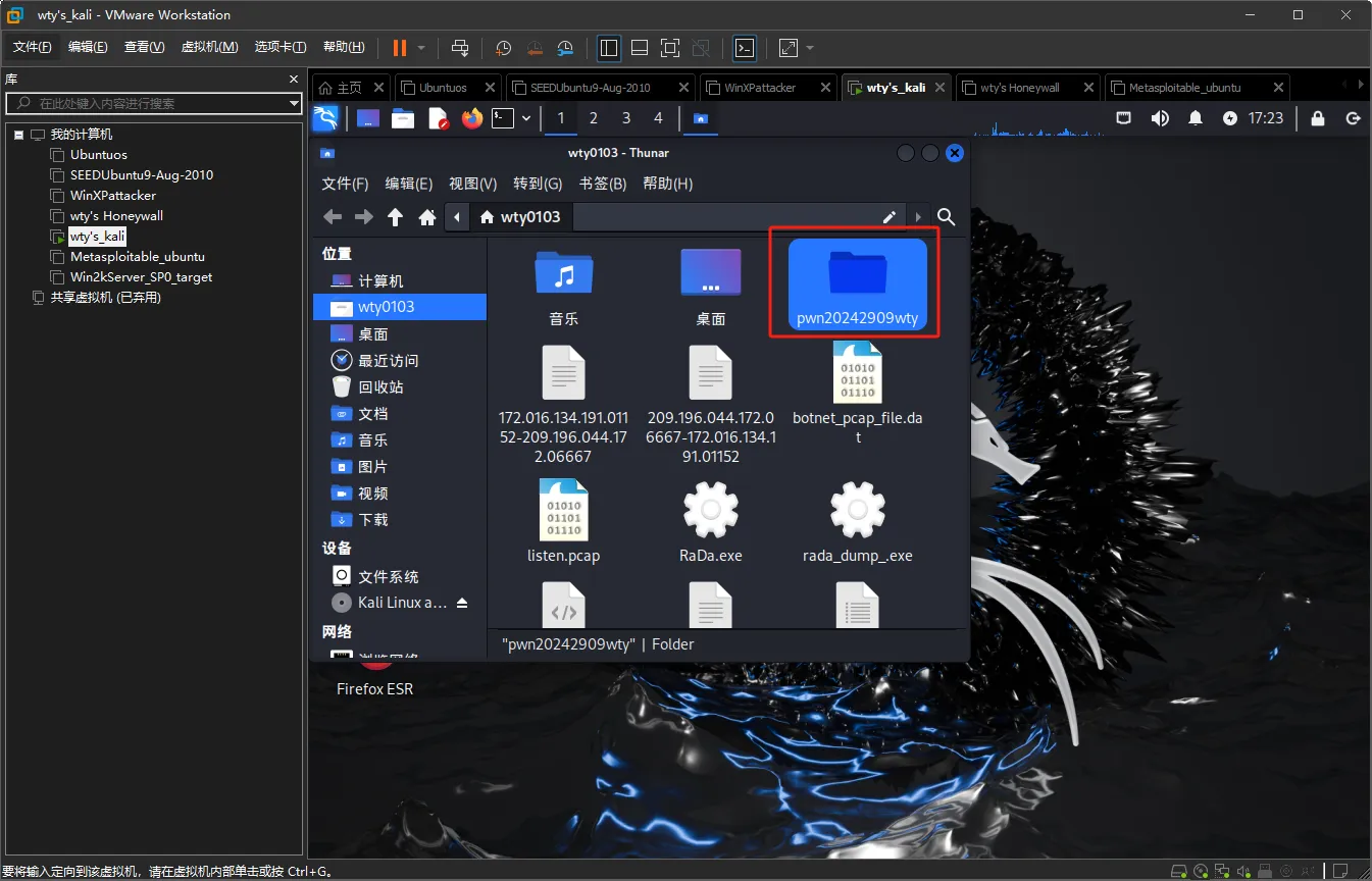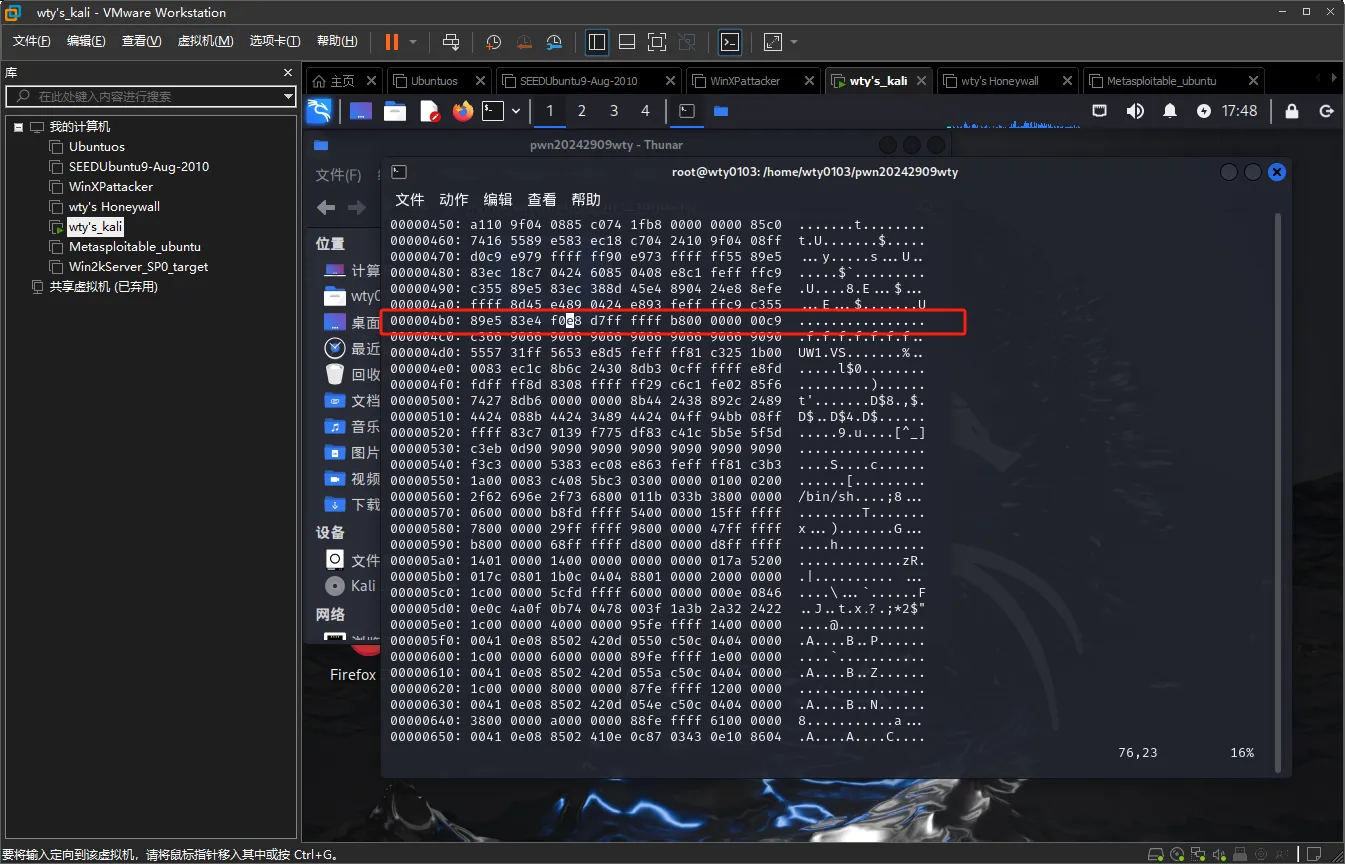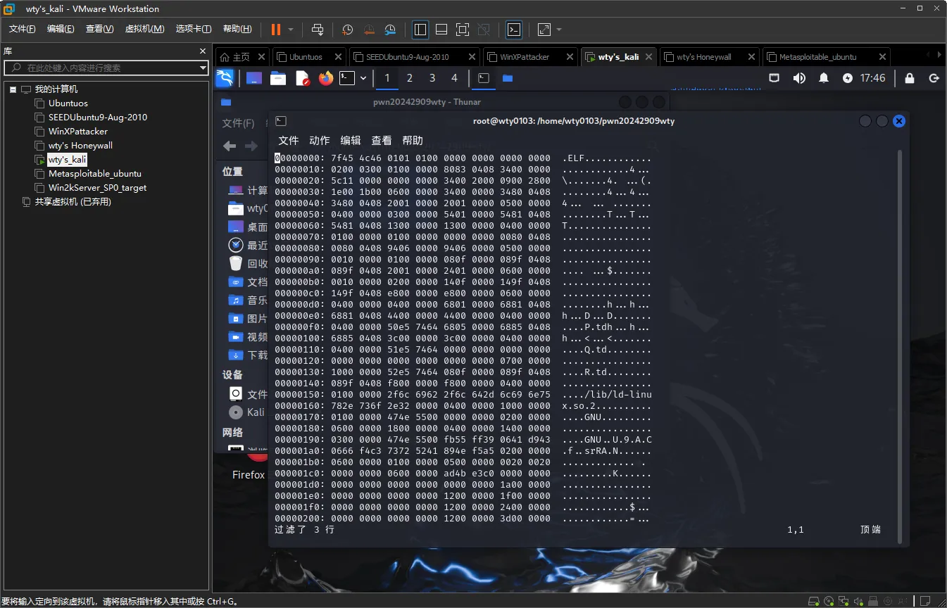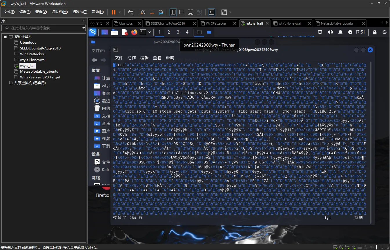将老师提供的存有linux可执行文件的文件夹拷贝到kali虚拟机中,文件夹、文件名以及kali虚拟机的名称均已修改为带有个人信息的名称