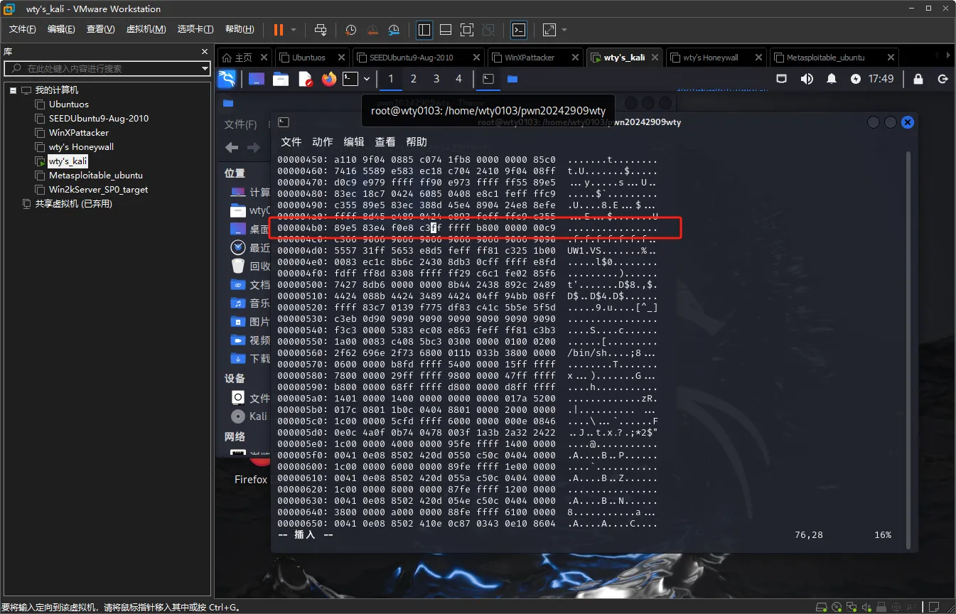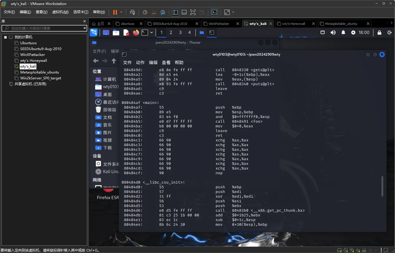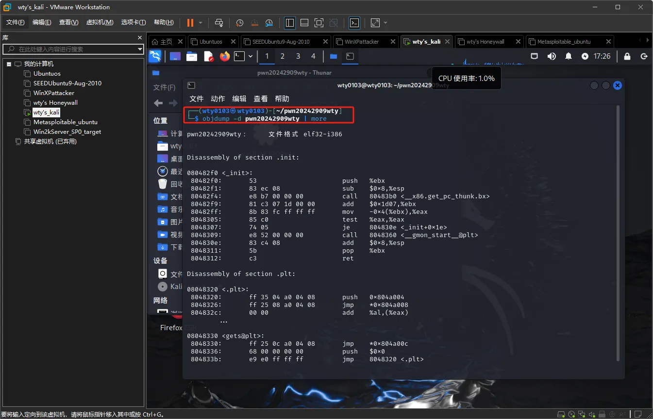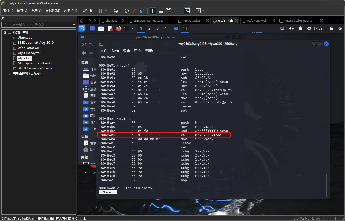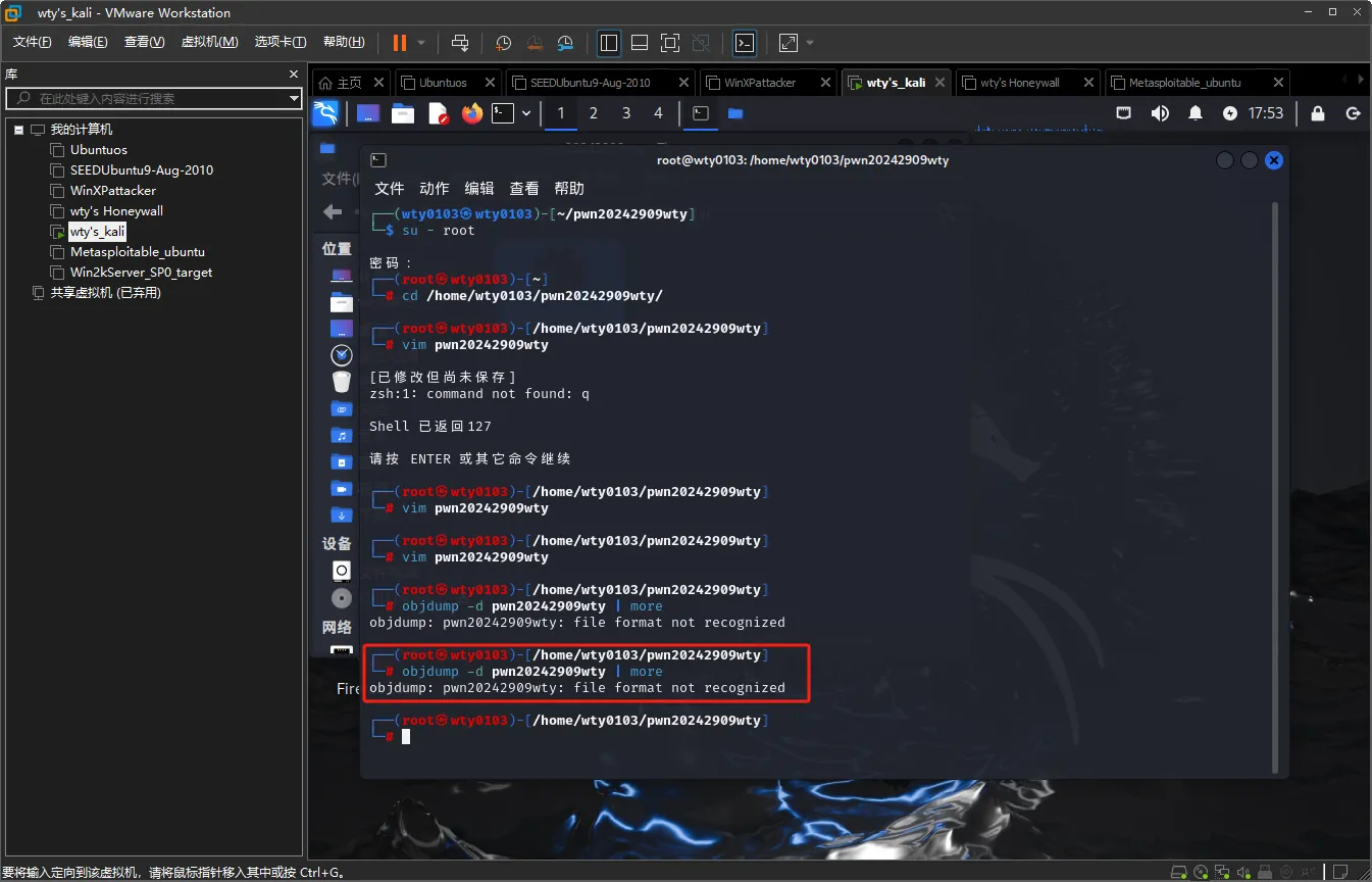 重新拷贝一份文件到kali虚拟机中,输入命令objdump -d pwn20242909wty | more反汇编未修改过的文件