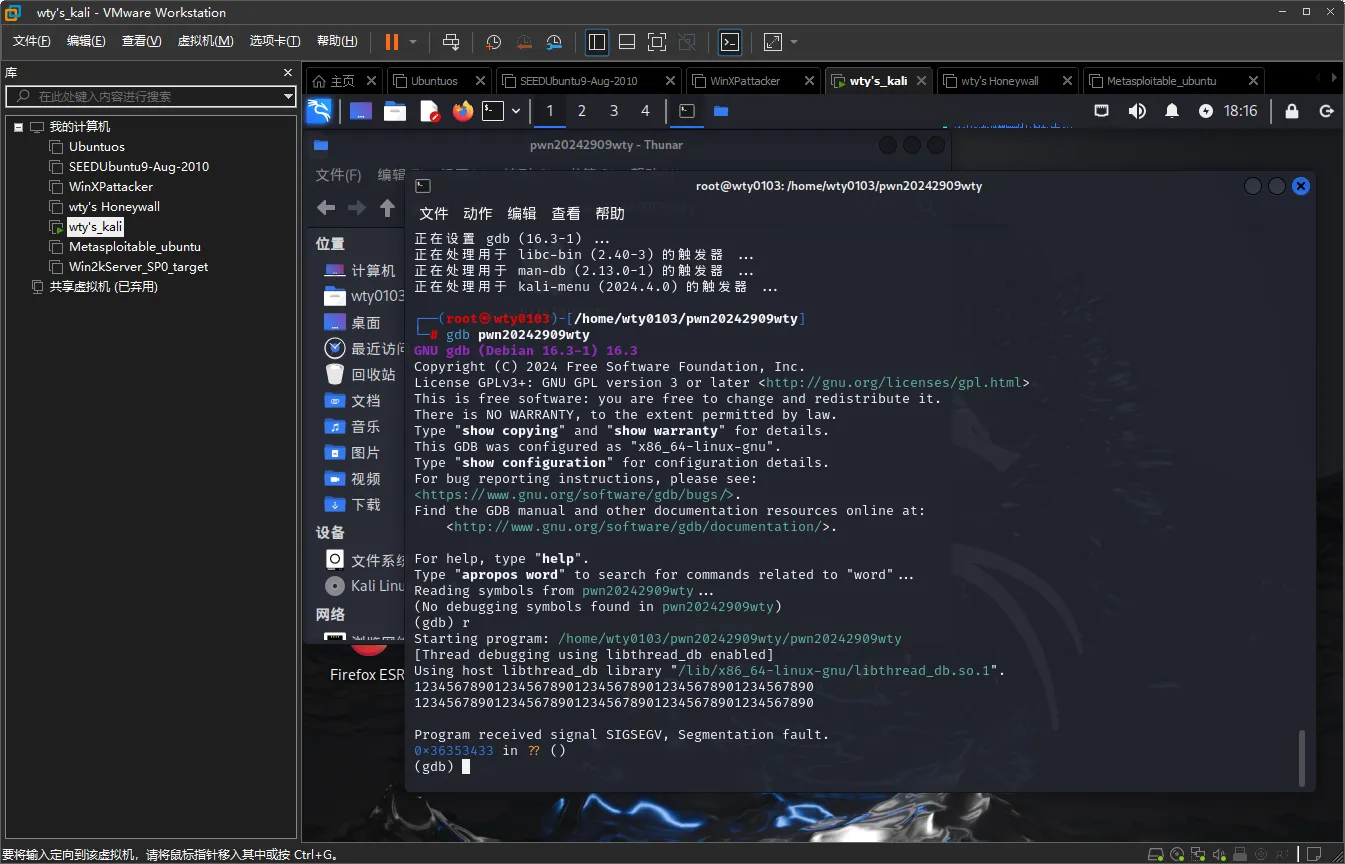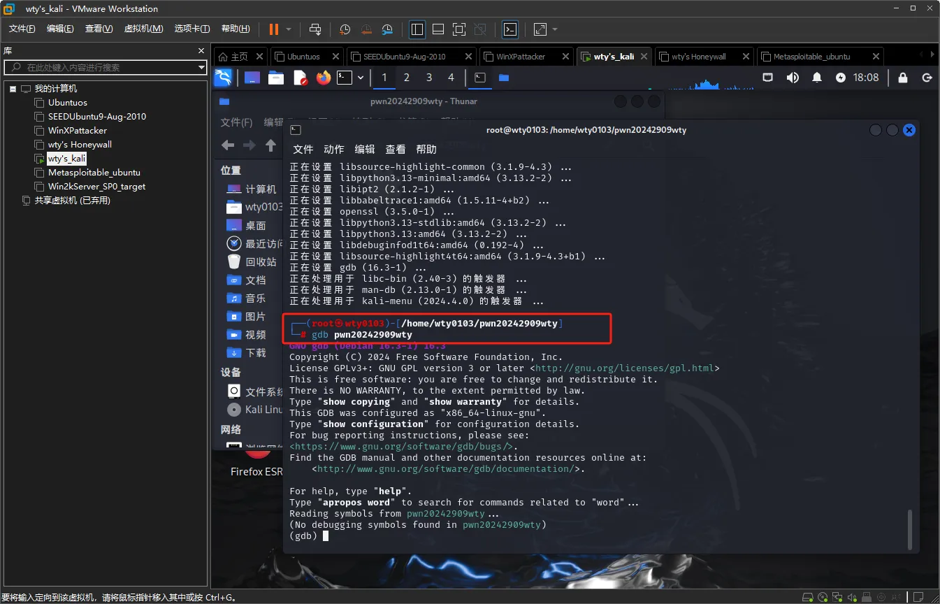 安装gdb工具后输入命令gdb pwn20242909wty进入gdb模式