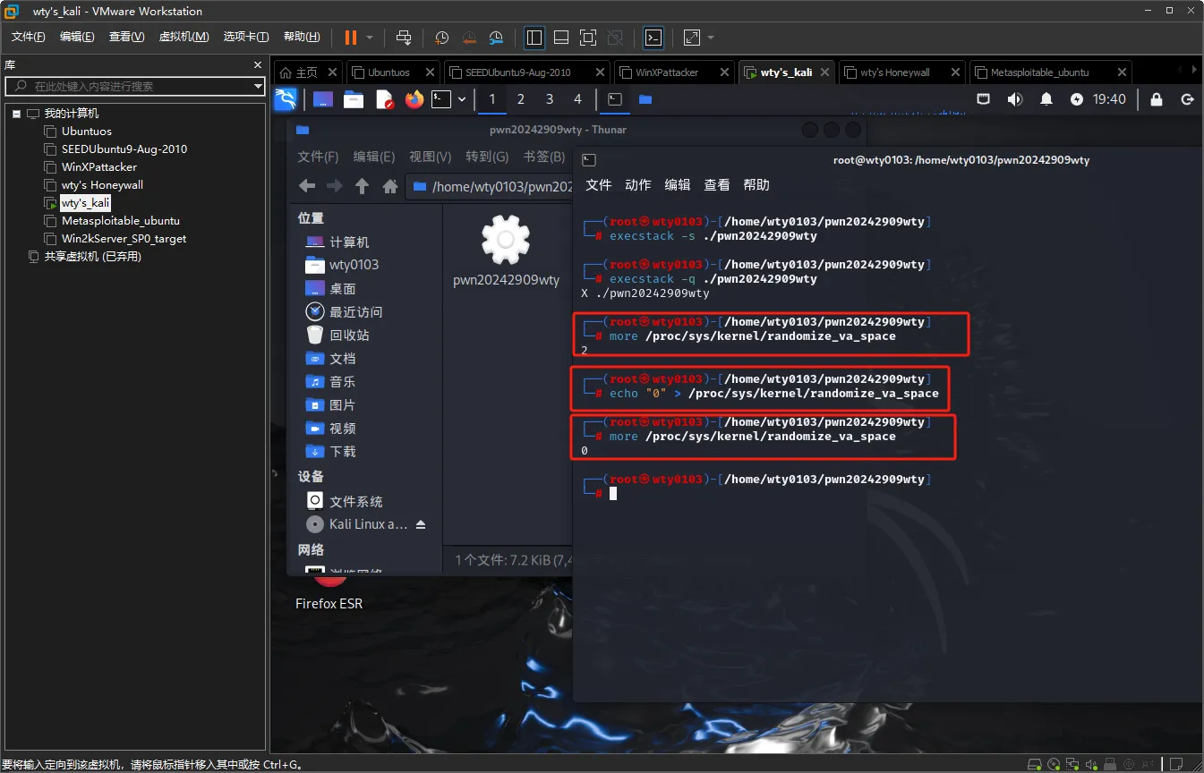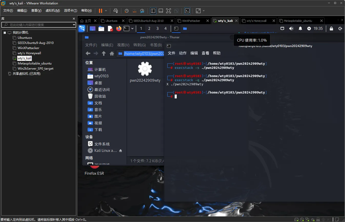输入命令execstack -s pwn20242909wty设置堆栈可执行,输入execstack -q pwn20242909wty查询文件的堆栈是否可执行