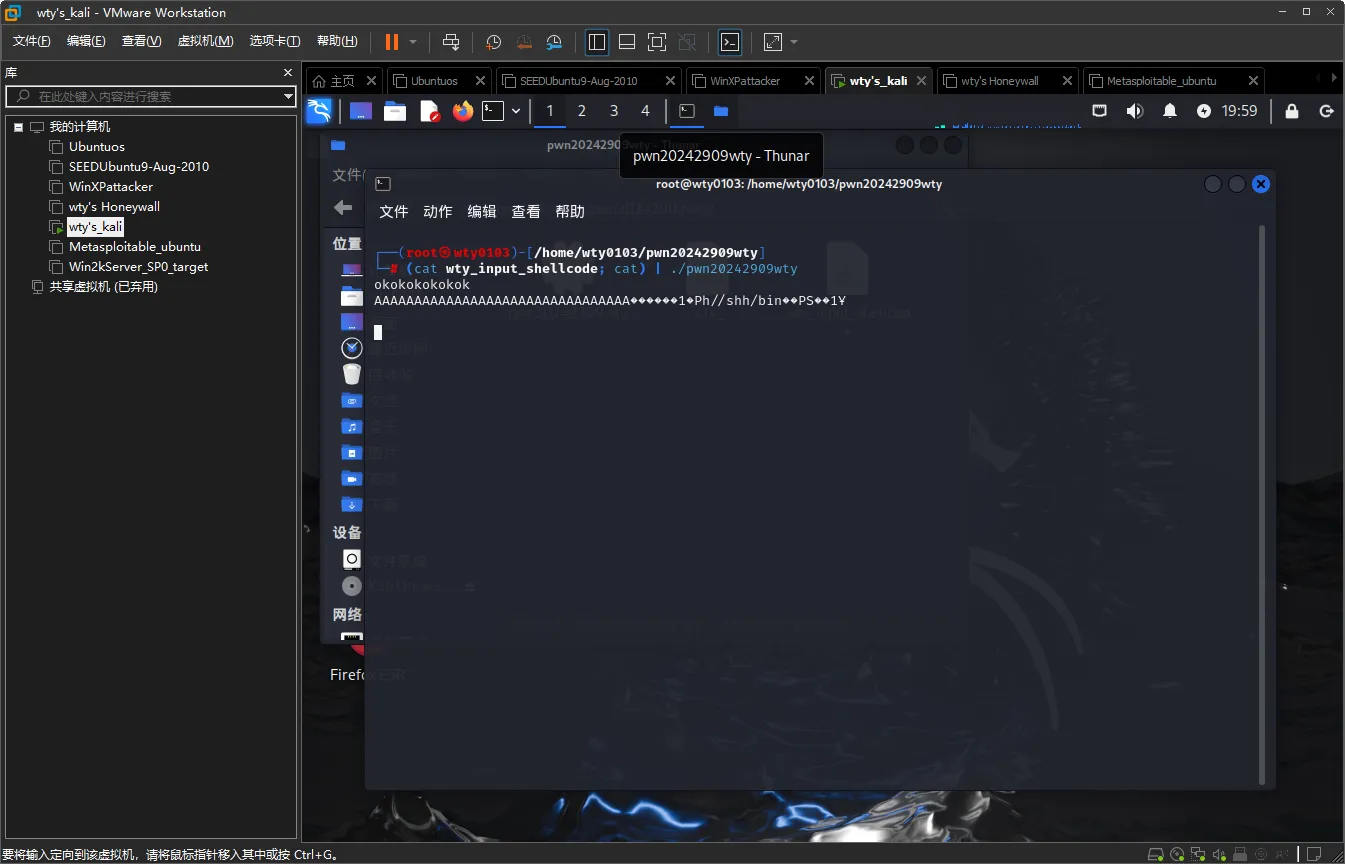 输入命令(cat wty_input_shellcode; cat) | ./pwn20242909wty将wty_input_shellcode的内容注入到pwn20242909wty中