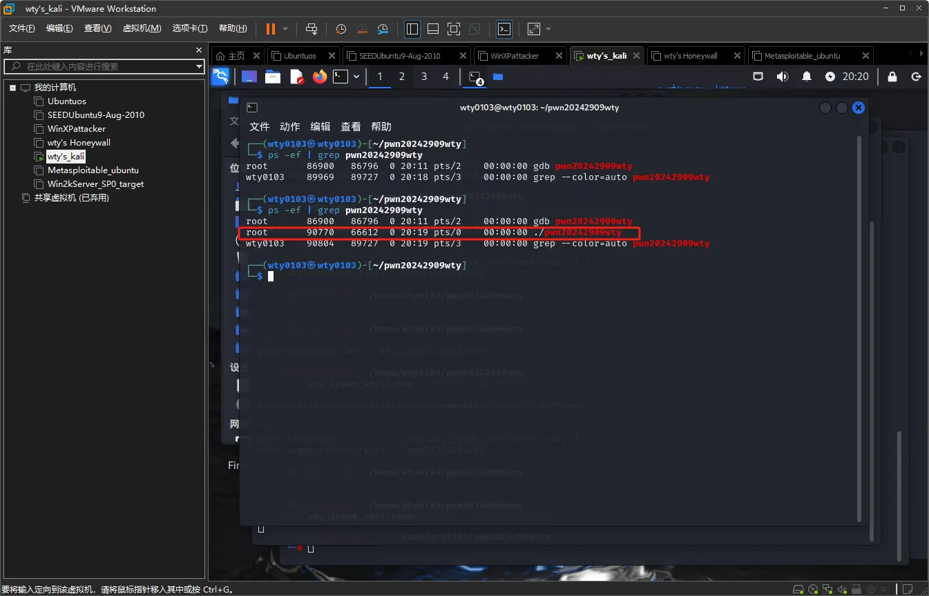 打开另一个终端,切换到root权限后输入命令ps -ef | grep pwn20242909wty查看到pwn20242909wty的端口号为90770