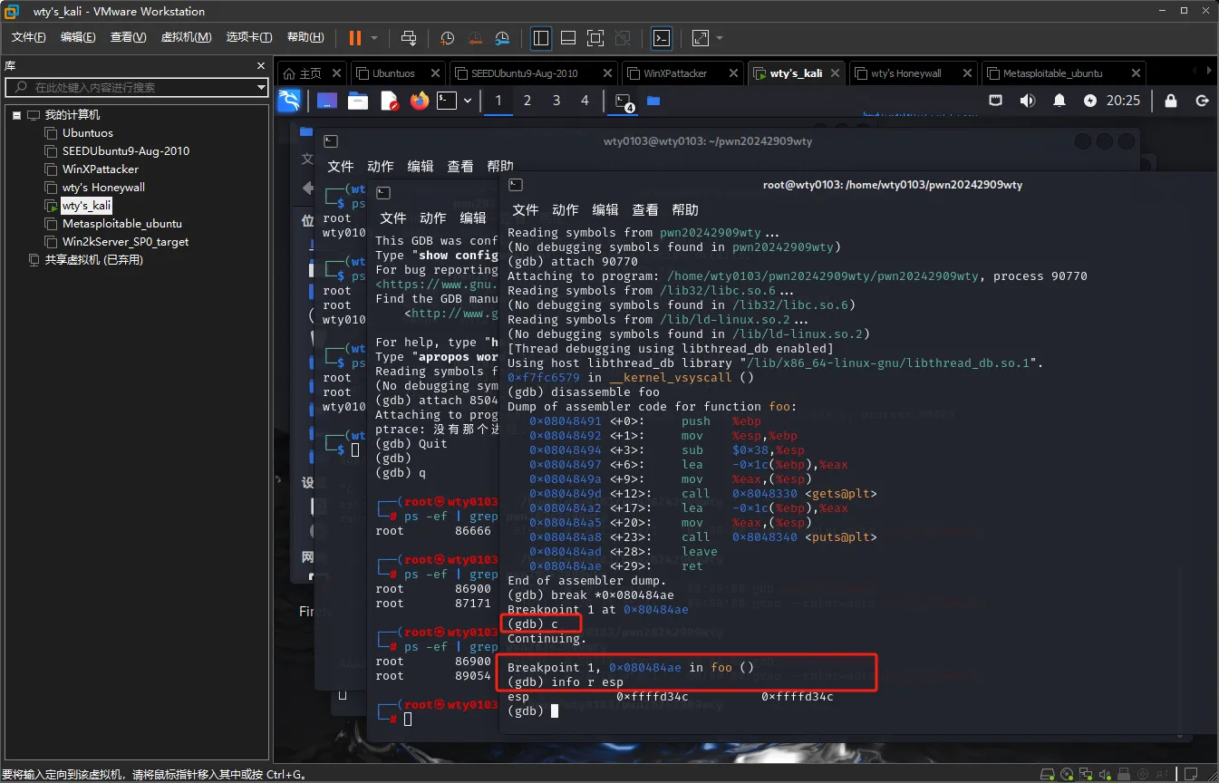 在另一个终端进入gdb调试,输入attach 90770,然后输入disassemble foo,接着输入break *0x080484ae设置断点