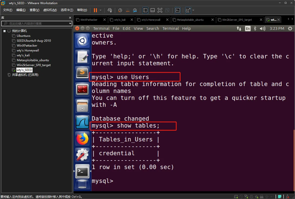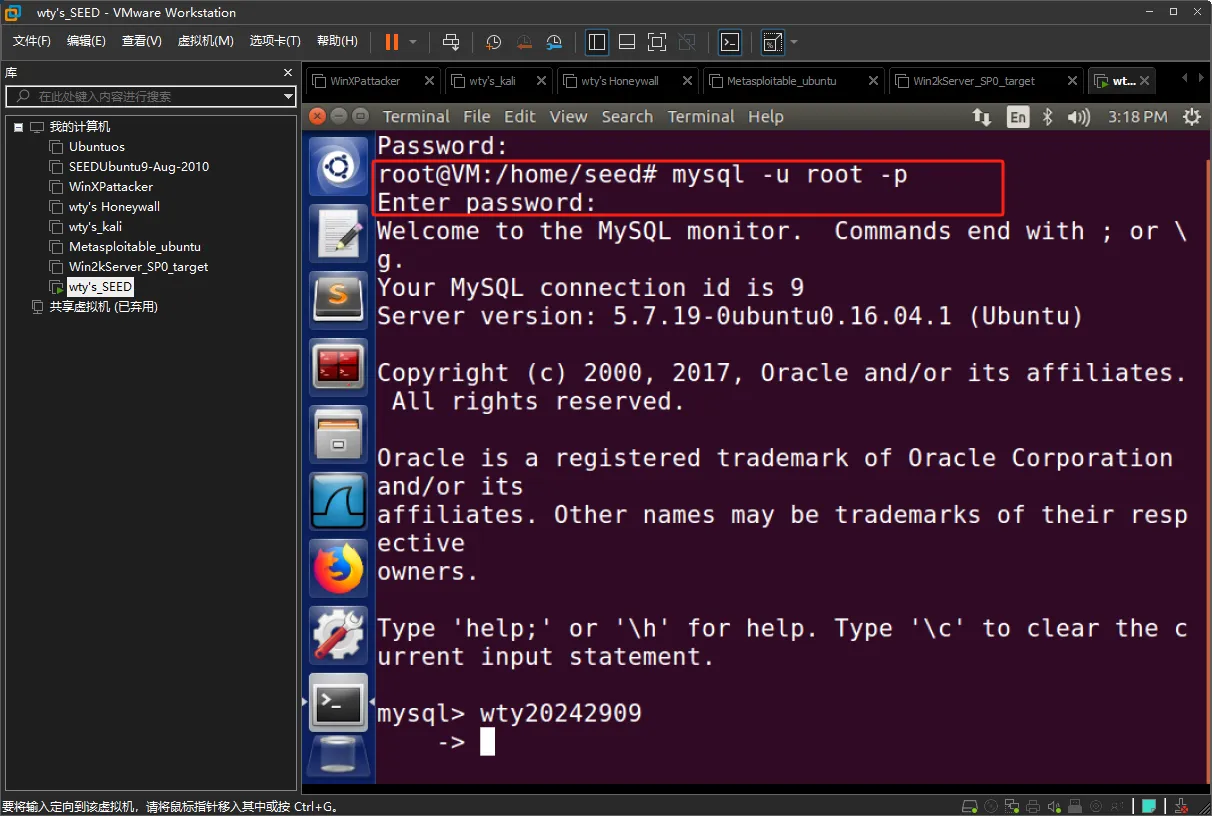 打开虚拟机终端命令行,输入命令mysql -u root -p登录数据库,密码为seedubuntu