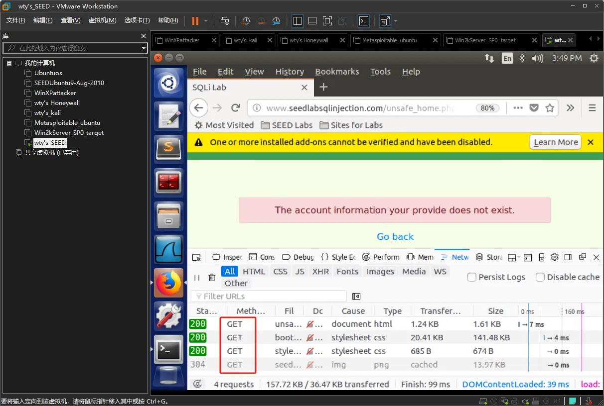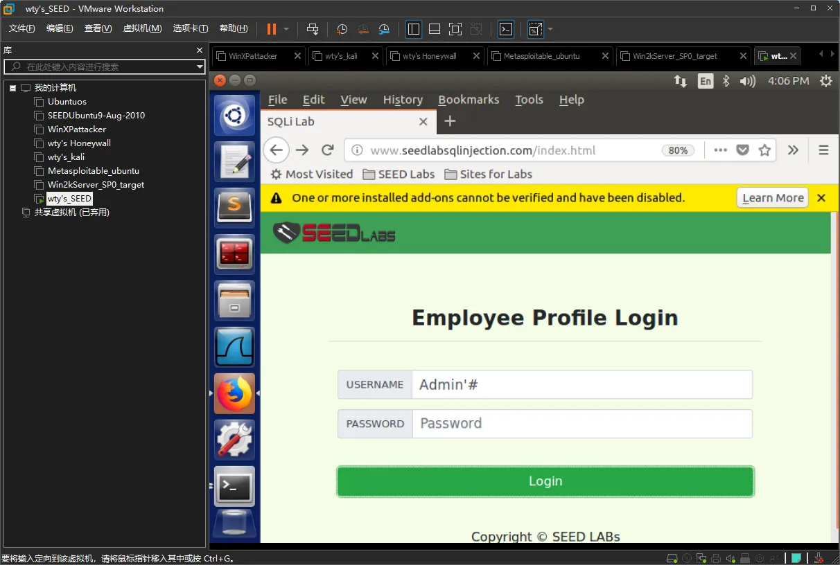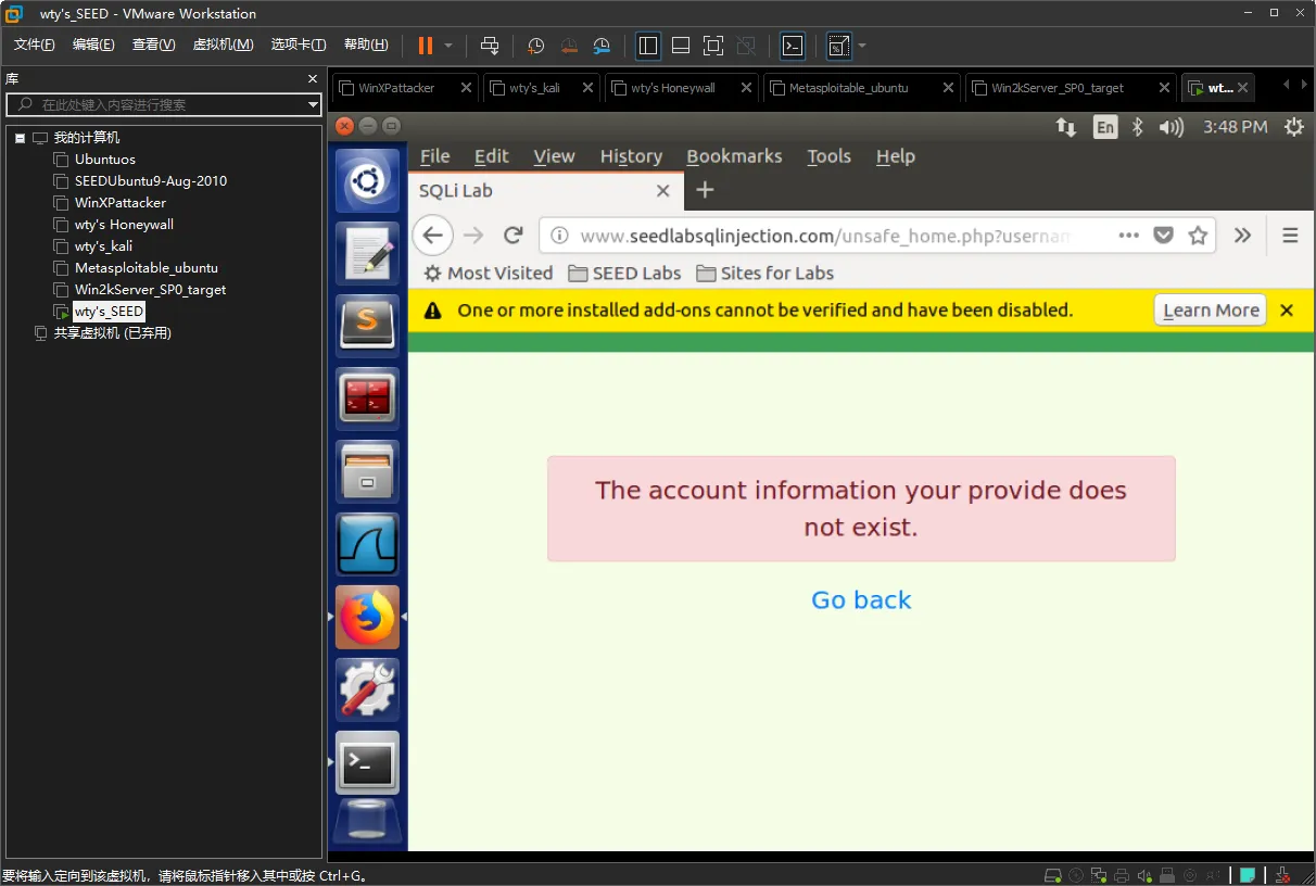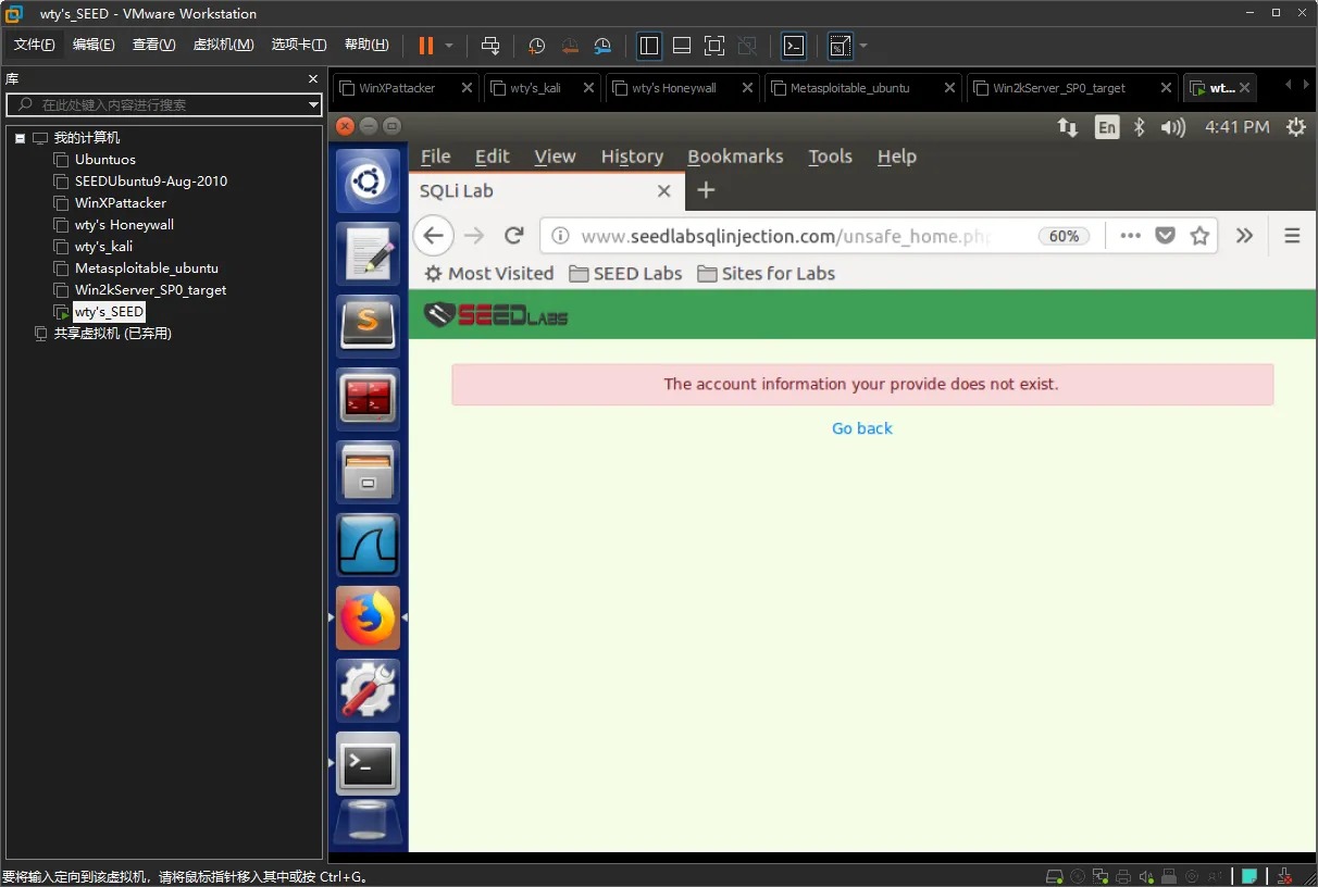 访问http://www.seedlabsqlinjection.com网站,随意输入用户名和密码,网站出现上图所示的提示