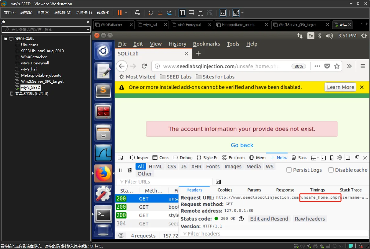 按F12键打开开发者工具,打开Network界面后刷新网页,发现用户名和密码如上图所示通过GET请求提交至unsafe_home.php页面进行身份检验