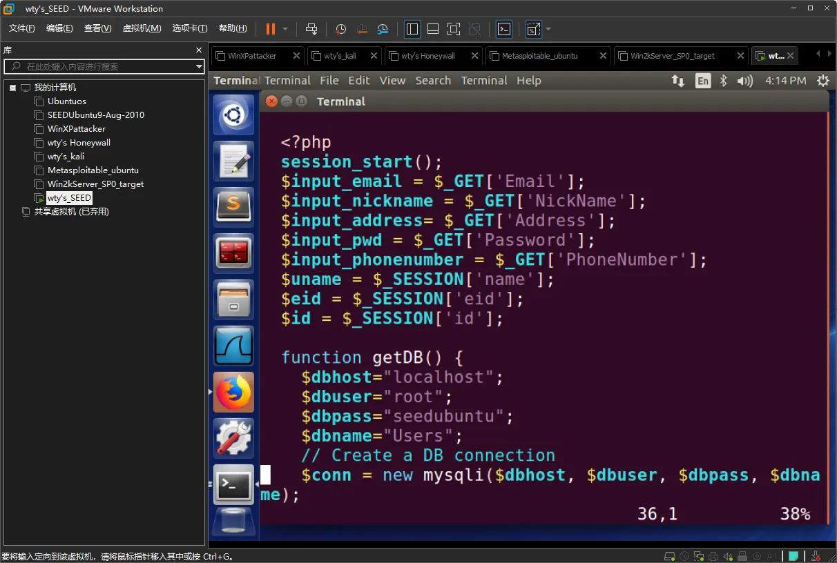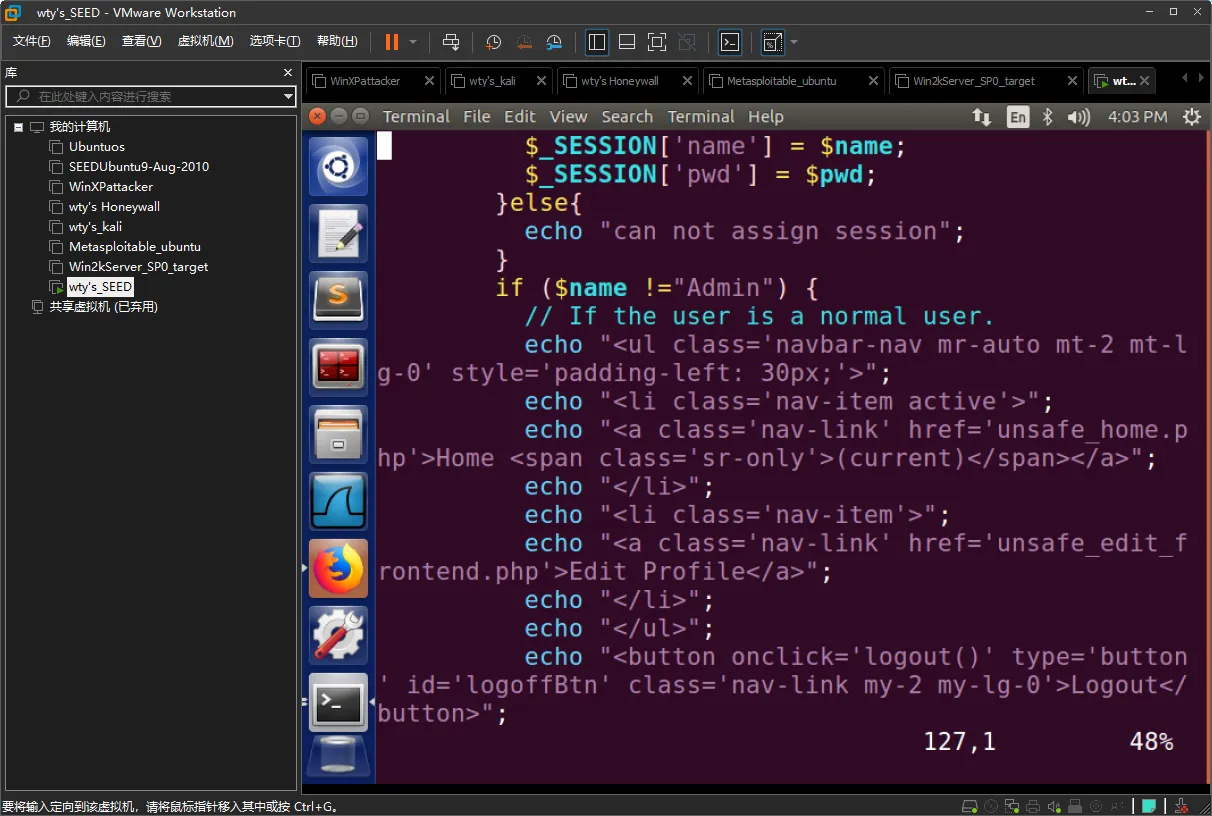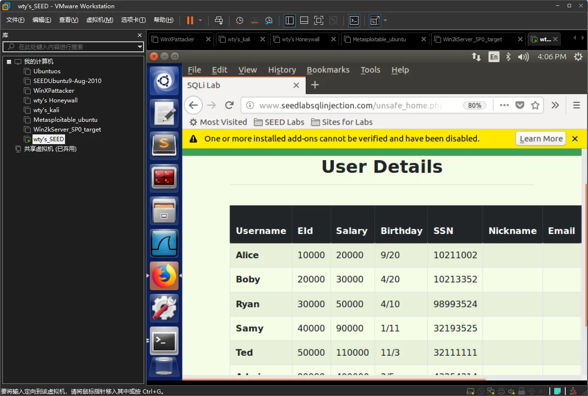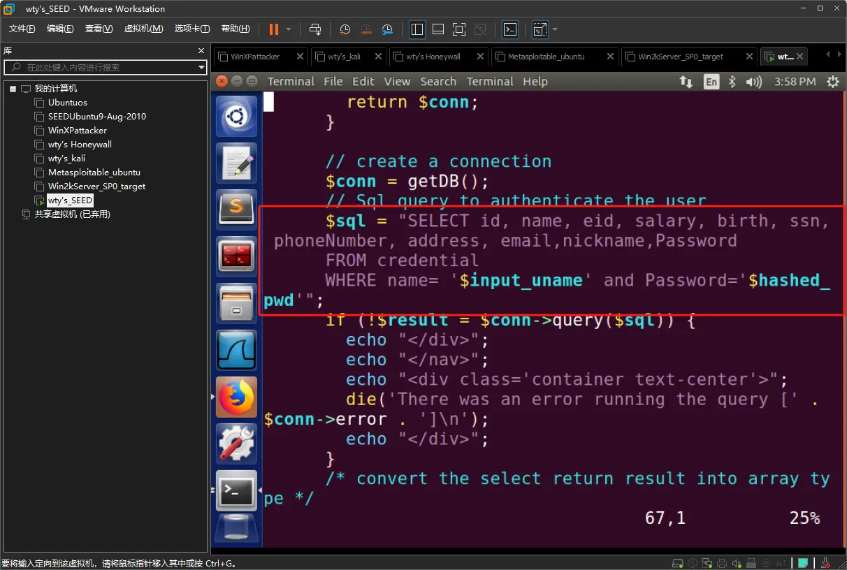 打开终端命令行,使用如下命令:vim /var/www/SQLInjection/unsafe_home.php打开该网站所对应的文件其中所使用到的SQL查询语句如下:SELECT id, name, eid, salary, birth, ssn, phoneNumber, address, email,nickname,Password FROM credential WHERE name= '$input_uname' and Password='$hashed_pwd'