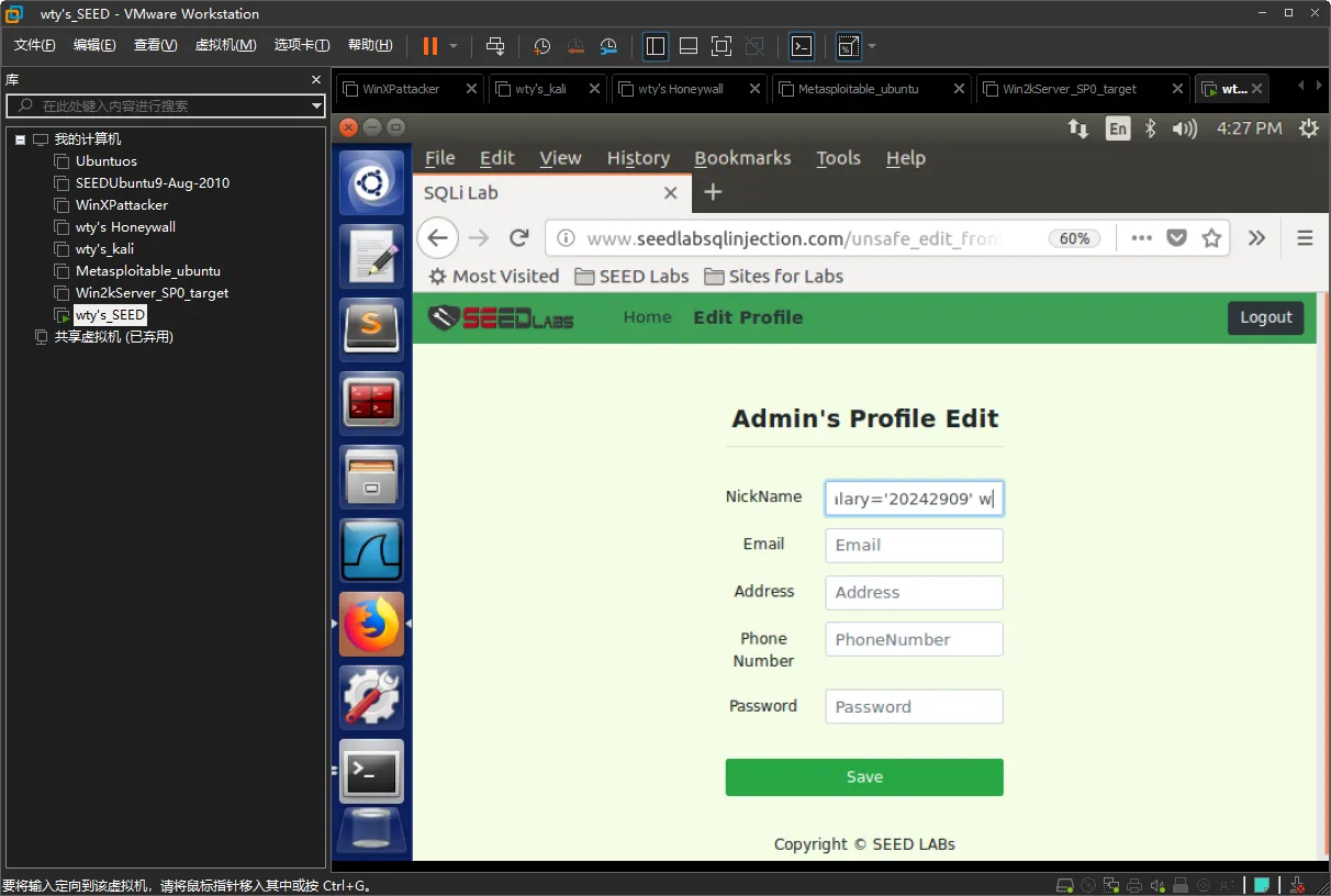 打开Edit Profile页面,在nickname栏输入', Salary='20242909' where name='Ryan';#,点击Save后发现界面中的Salary项成功修改