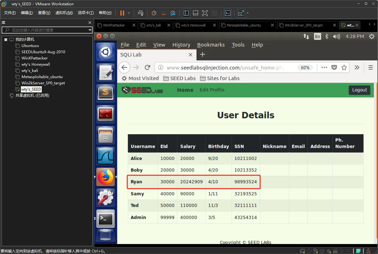 使用命令vim /var/www/SQLInjection/unsafe_edit_backend.php 查看后端代码,观察代码可以发现查询语句回改变不应改变的字段的值,例如假设输入nickname字段为‘,Salary='1' where Name='Ryan';#,最终结果不该改变的salary值会被成功修改
