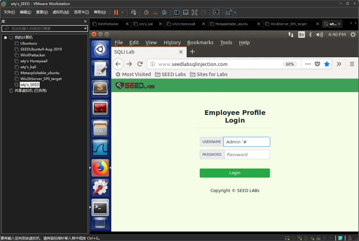 对SELECT语句的SQL注入攻击:上述Web应用存在SQL输入漏洞,任务是在不知道密码的情况下登陆该Web应用程序。