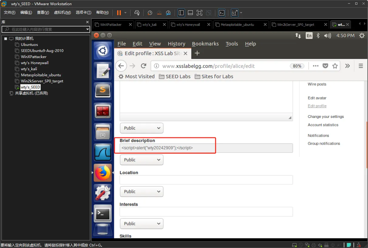 进入到Edit profile页面后,在Brief description中输入XSS攻击代码点击保存后提示弹窗消息