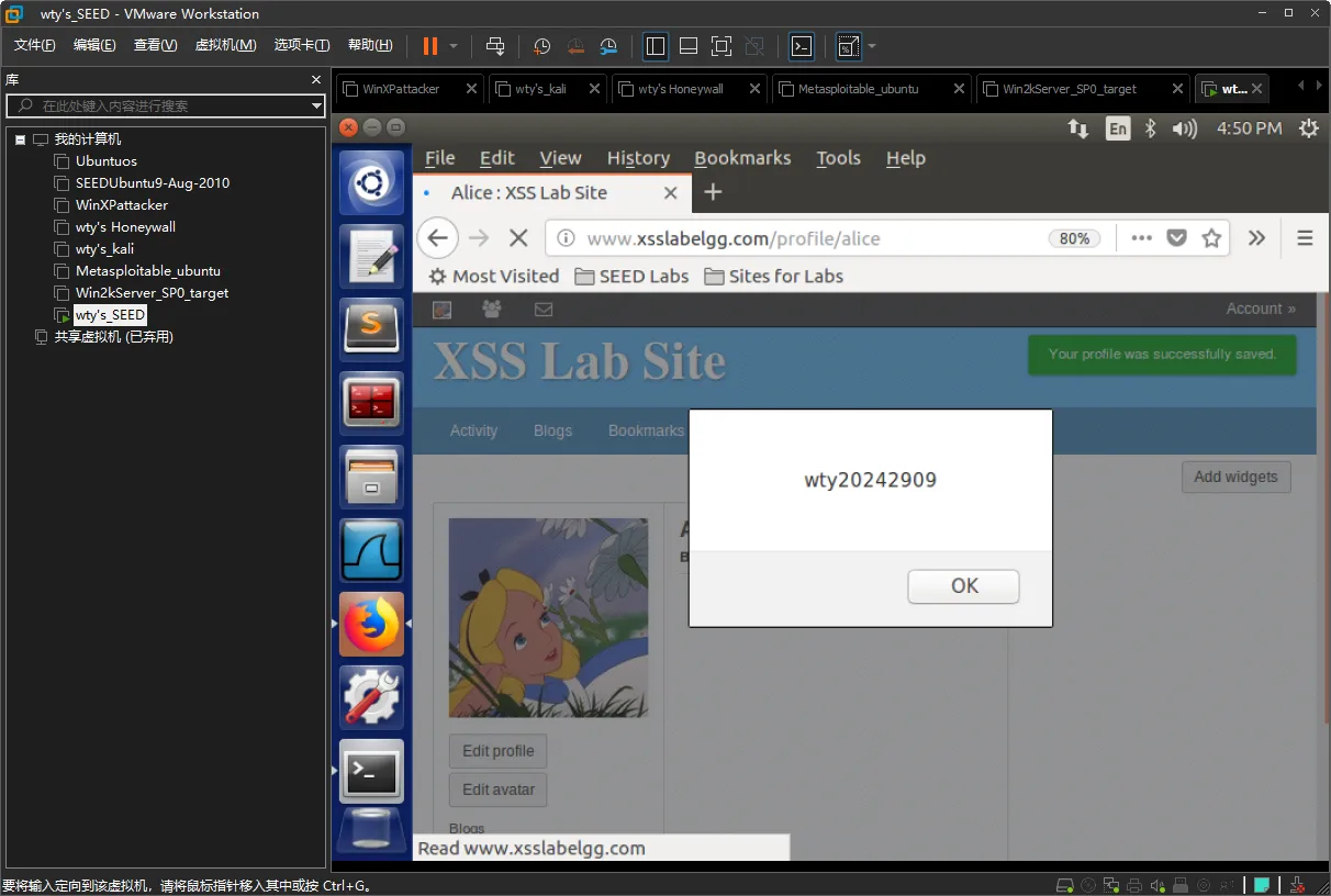 发布恶意消息,显示警报窗口:在您的Elgg配置文件中嵌入一个JavaScript程序,以便当另一个用户查看您的配置文件时,将执行JavaScript程序并显示一个警报窗口。