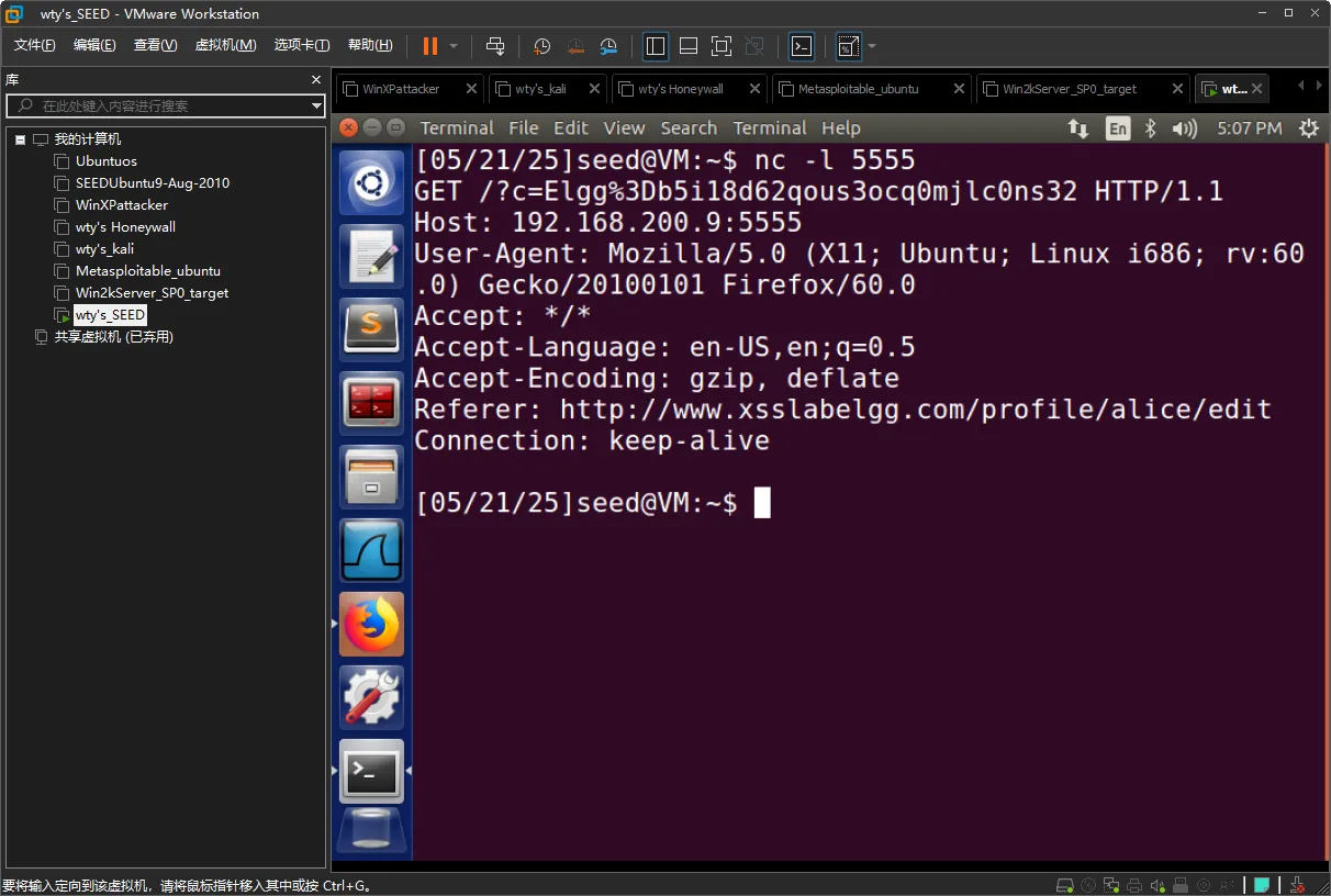打开命令行输入命令nc -l 5555监听5555端口,之后只要有用户访问Alice的主页,netcat就会接收到该用户的cookie