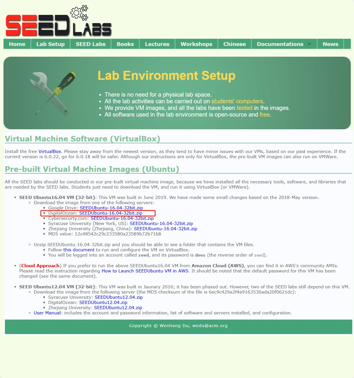 访问https://seedsecuritylabs.org/lab_env.html,下载实验需要用到的SEEDUbuntu-16.04-32虚拟机资源,下载完成后安装配置虚拟机,结束后启动新安装的SEED虚拟机