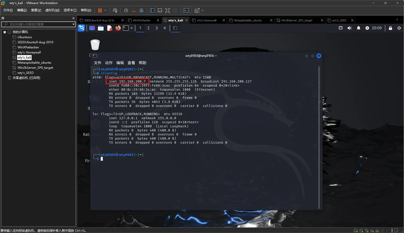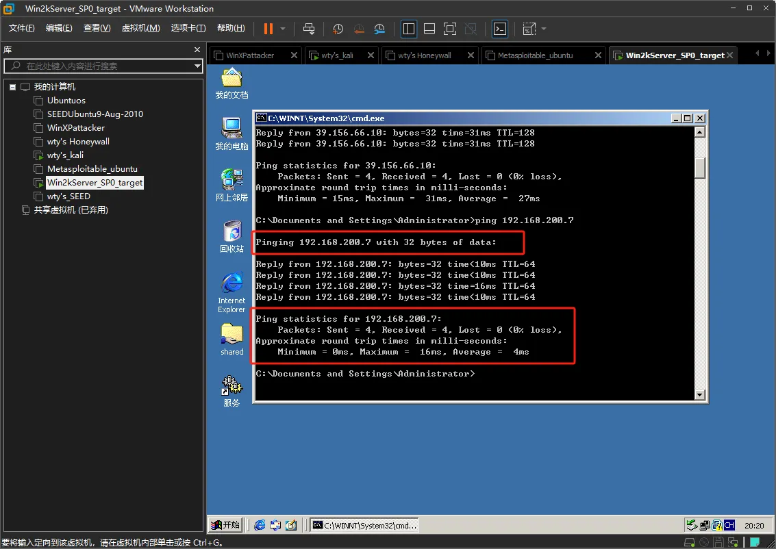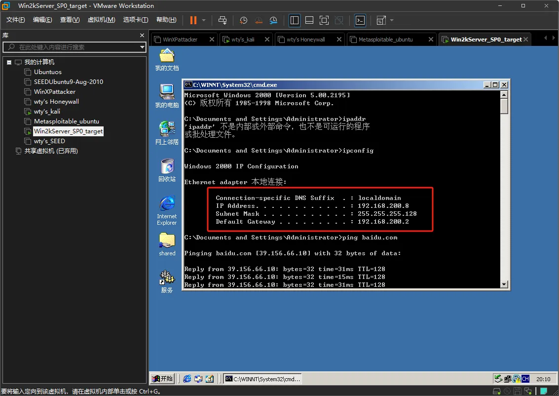 启动kali虚拟机和win2k虚拟机,使用命令查询二者的ip地址,kali虚拟机(攻击机)的IP为192.168.200.7,win2k虚拟机(靶机)的IP为192.168.200.8。使用ping命令进行攻击机和靶机之间的连通性测试,结果显示正常连通