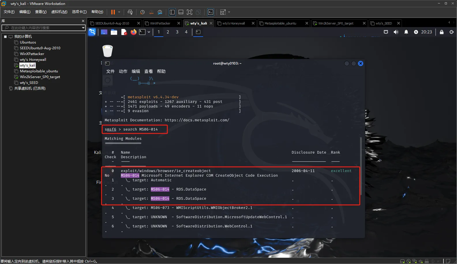 输入命令msfconsole启动metasploit后输入命令search MS06-014,查询可用的攻击模块