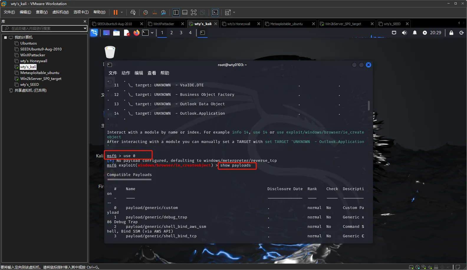 输入命令use 0和命令show payloads查看可用的攻击载荷
