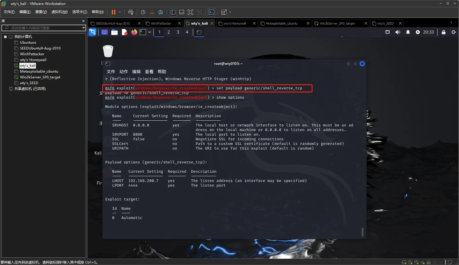 任务:使用攻击机和Windows靶机进行浏览器渗透攻击实验,体验网页木马构造及实施浏览器攻击的实际过程。